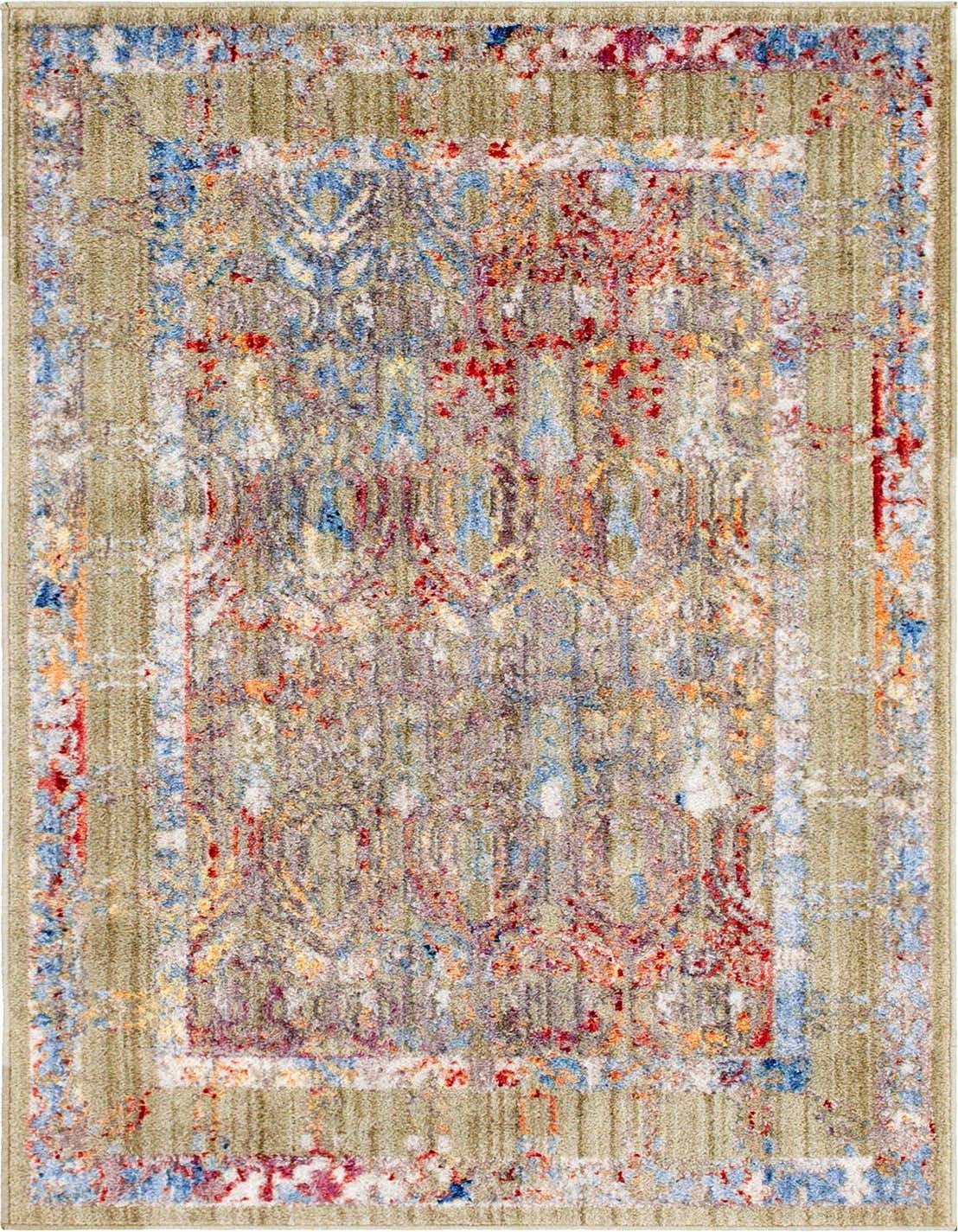 I bought this rug for a small office/guest room. I have a sage green sleeper sofa and the colors matched perfectly. The pattern is slightly muted without looking to dull which I love. I rolled the rug with the pattern out for a few days to get rid of the rolled up corners and the rug lays perfectly flat now. Very happy with this rug.