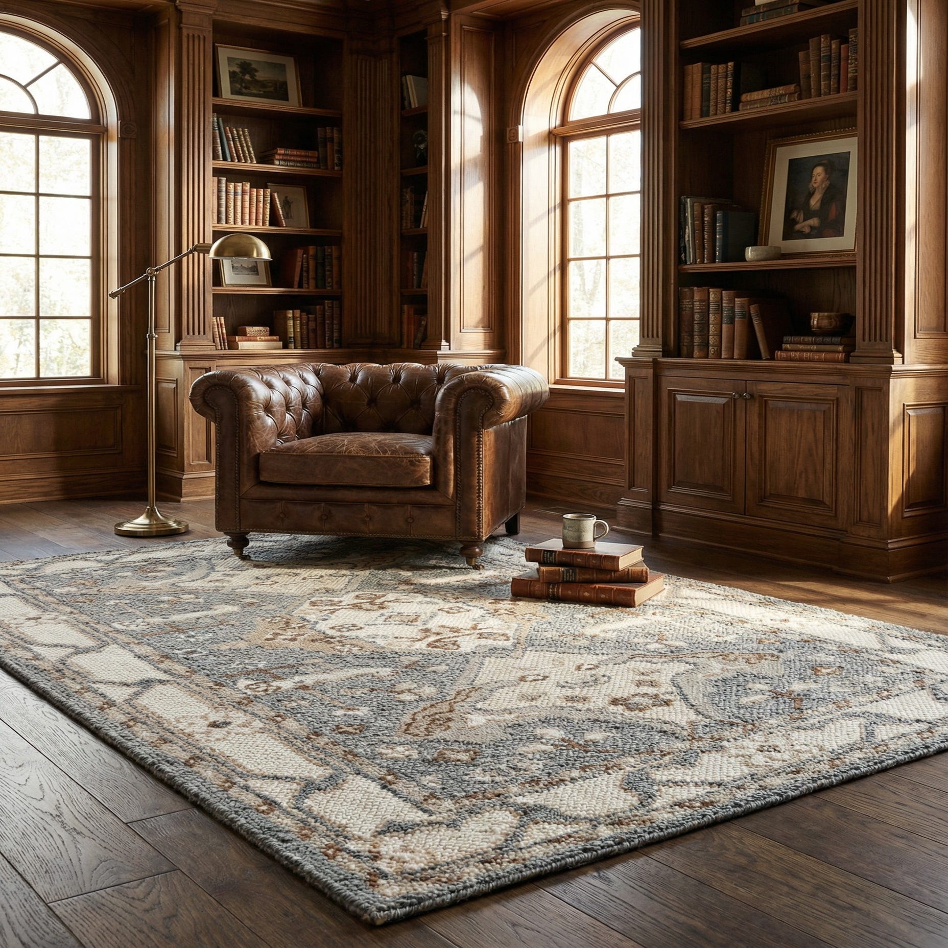 Primary color is Antique Gray. Colors in this rug include: Antique Gray, Beige, Brown, Ivory.