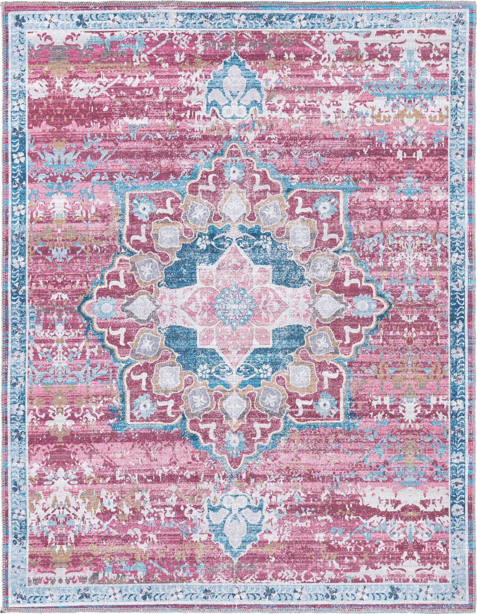Primary color is Antique Pink. Colors in this rug include: Antique Pink, Blue, Burgundy, Ivory, Gray, Peach, Pink, Light Blue.