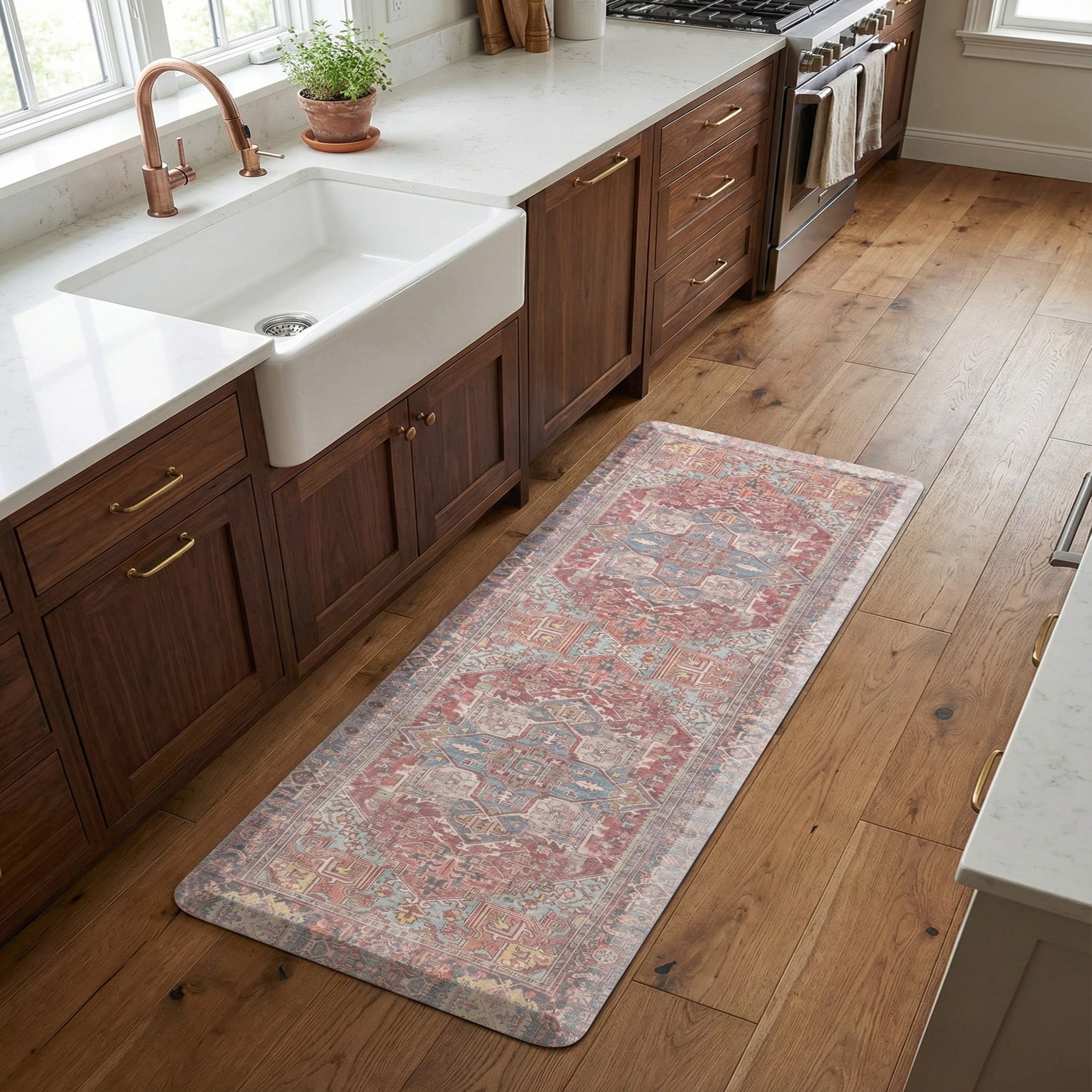 Primary color is Antique Red. Colors in this rug include: Antique Red, Brown, Rust Red, Green, Blue, Beige, Yellow, Black.