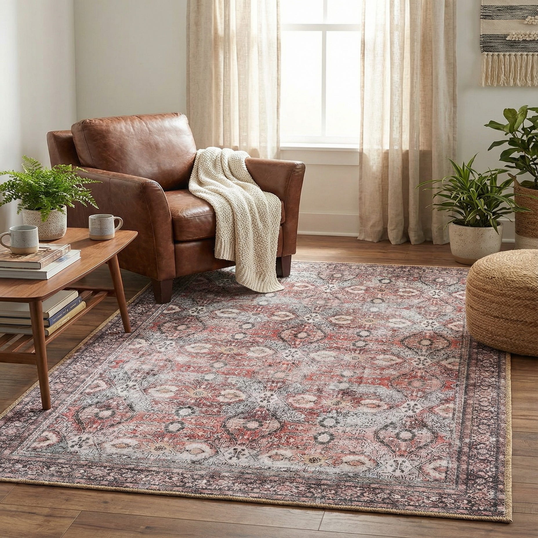 Primary color is Antique Red. Colors in this rug include: Antique Red, Black, Blue, Brown, Beige.
