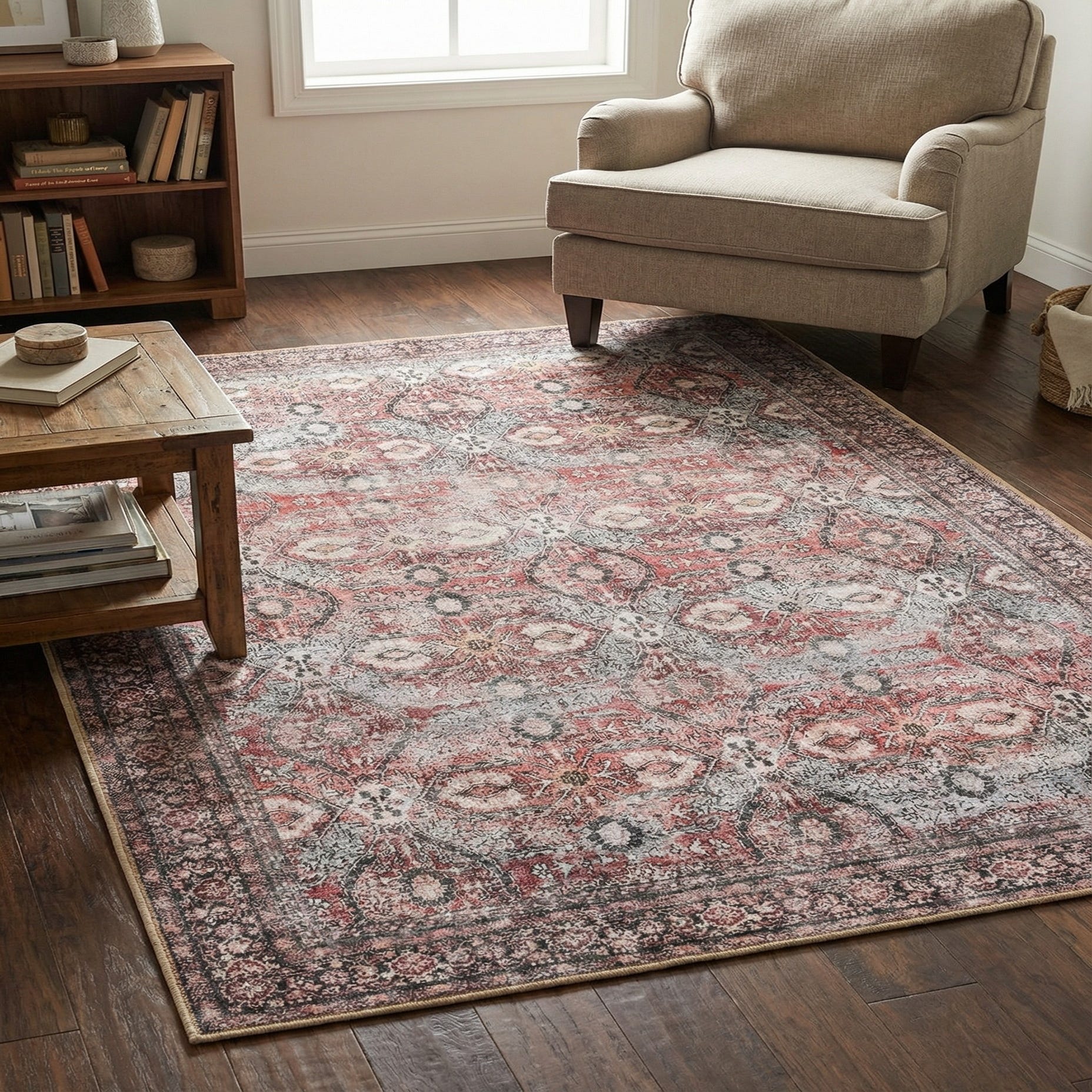 Primary color is Antique Red. Colors in this rug include: Antique Red, Beige, Black, Blue, Brown.