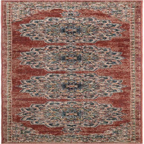 Primary color is Antique Red. Colors in this rug include: Antique Red, Beige, Black, Blue, Green, Ivory, Light Green, Orange, Purple.