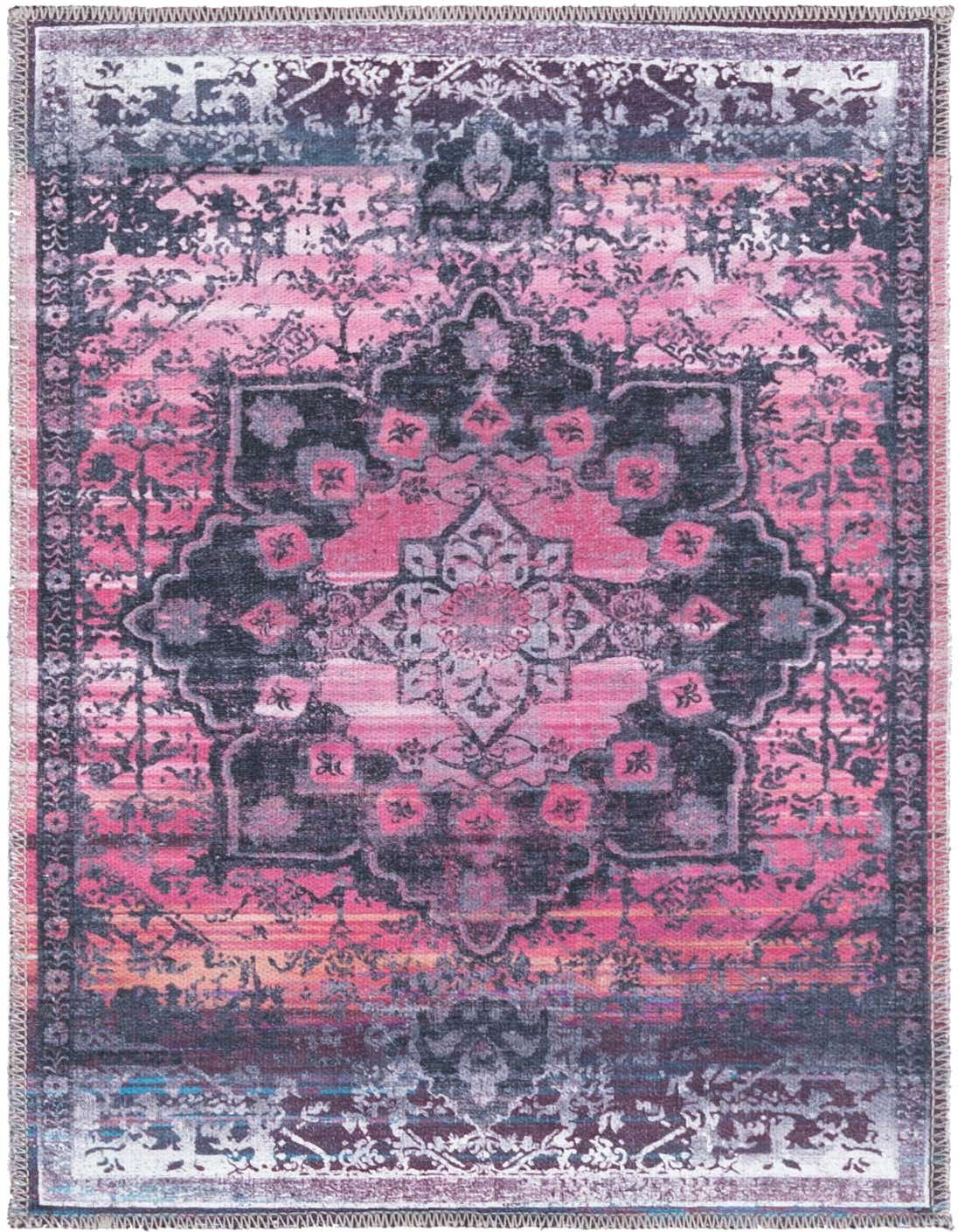 Primary color is Antique Rose. Colors in this rug include: Antique Rose, Black, Blue, Gray, Ivory, Orange, Pink.