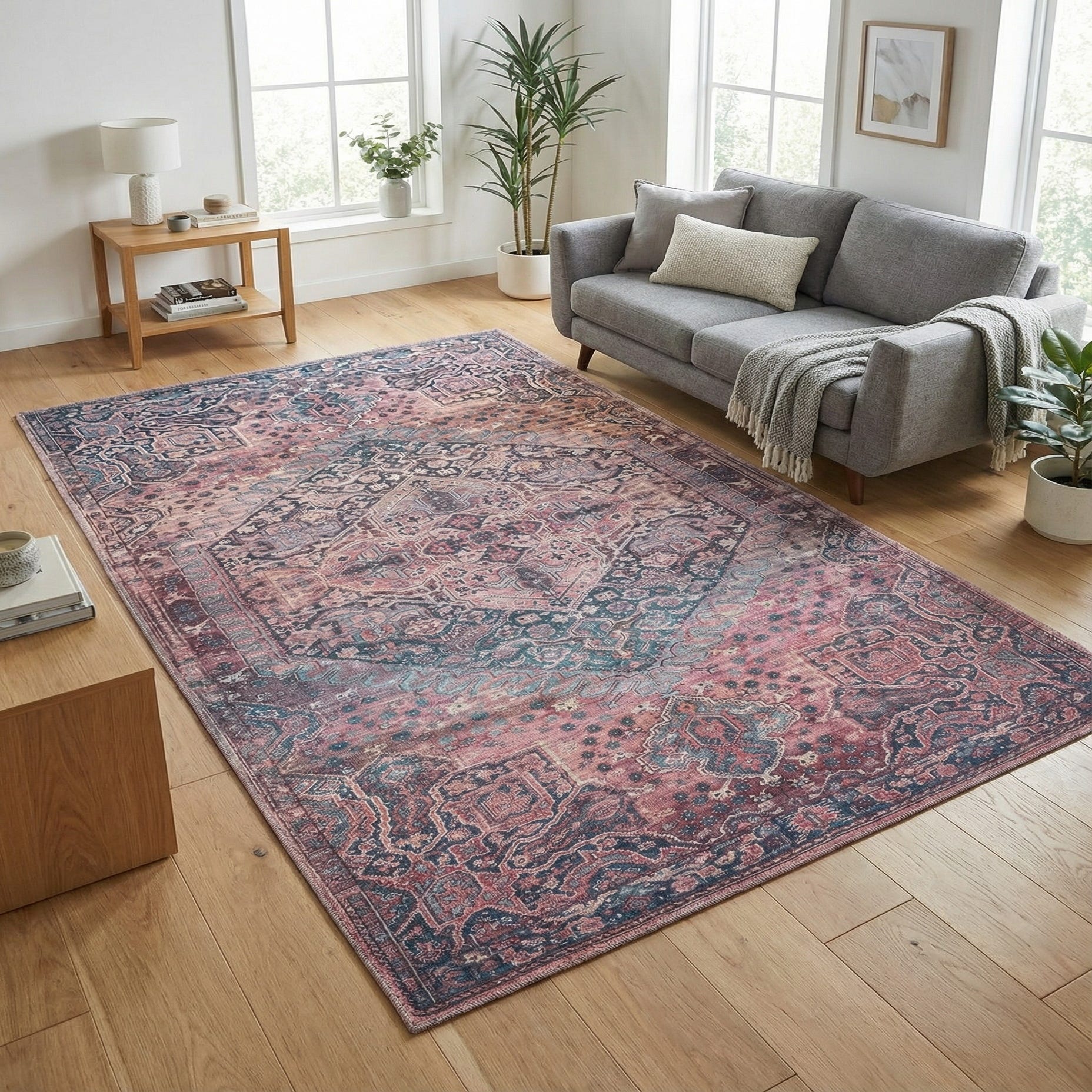 Primary color is Antique Rust Red. Colors in this rug include: Antique Rust Red, Blue, Ivory, Gray, Navy Blue, Light Blue.