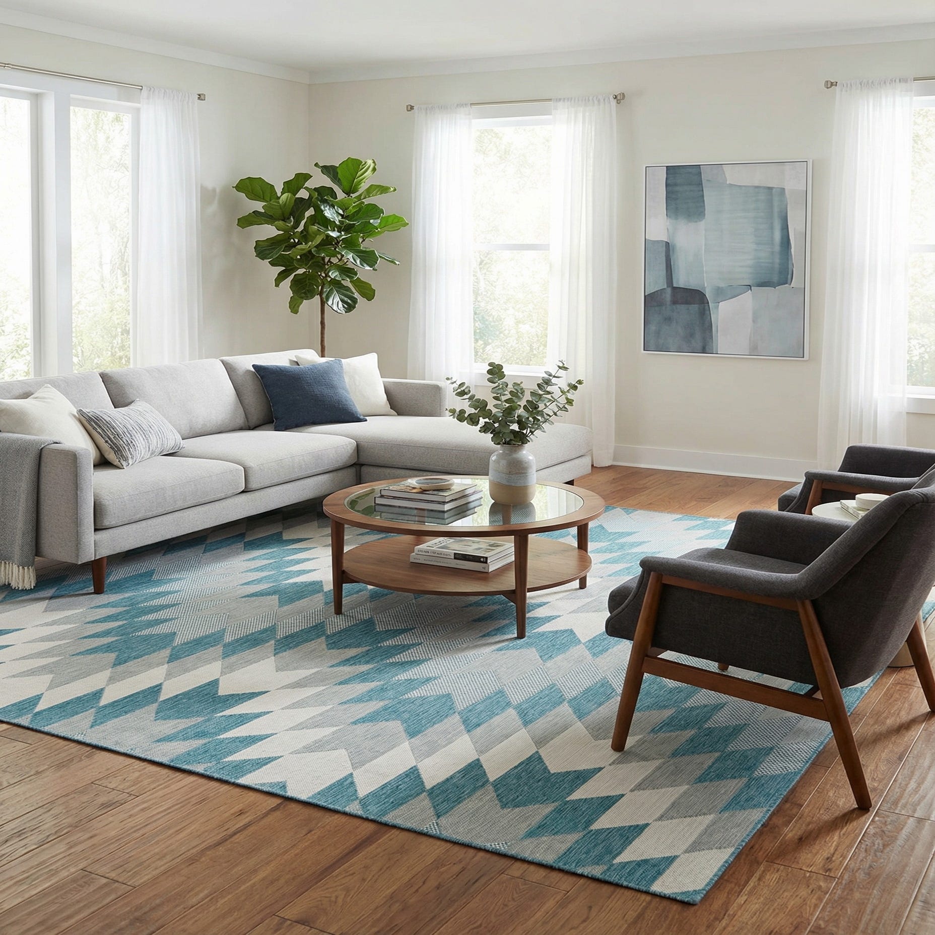 Primary color is Aqua. Colors in this rug include: Aqua, Ivory.