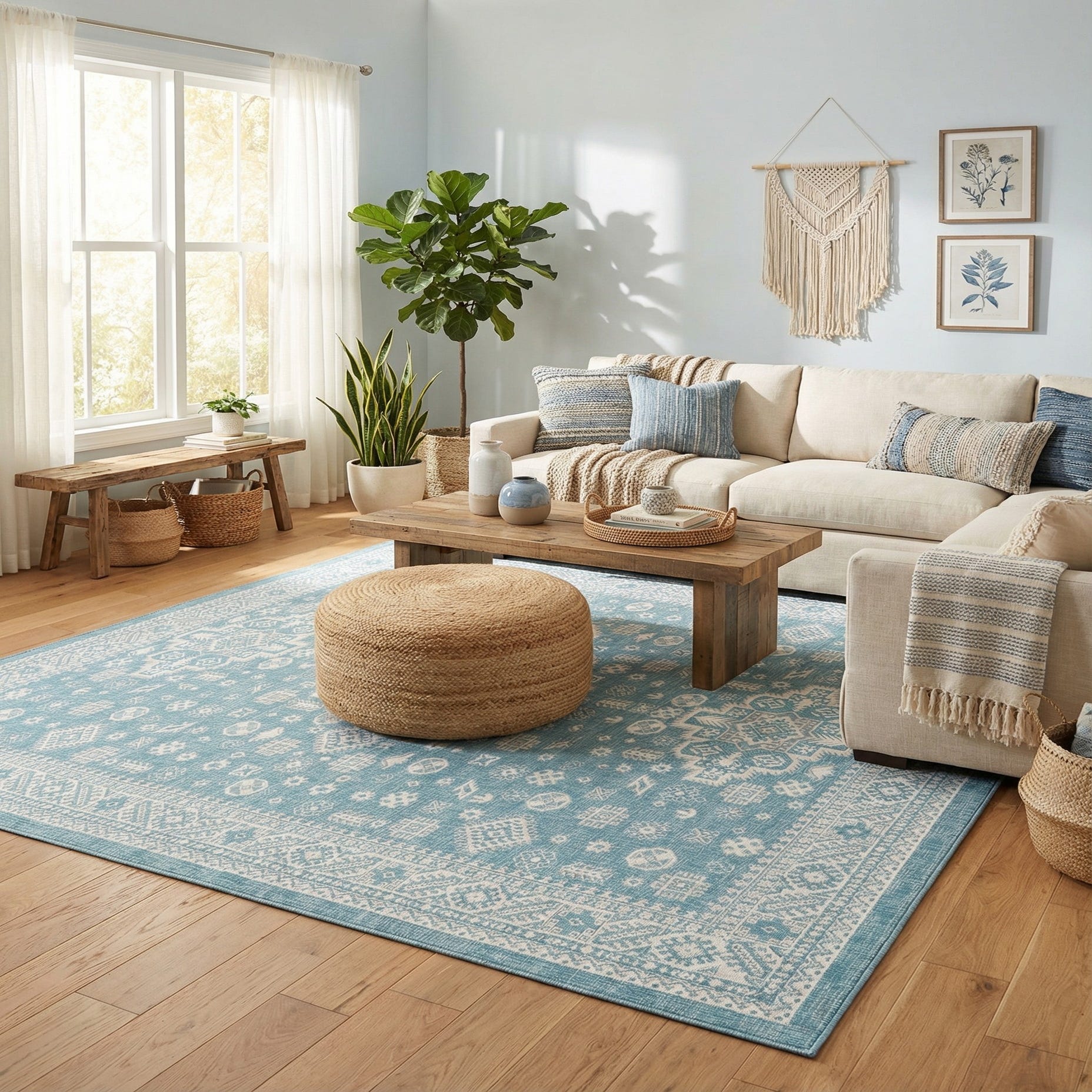 Primary color is Aqua. Colors in this rug include: Aqua, Ivory.