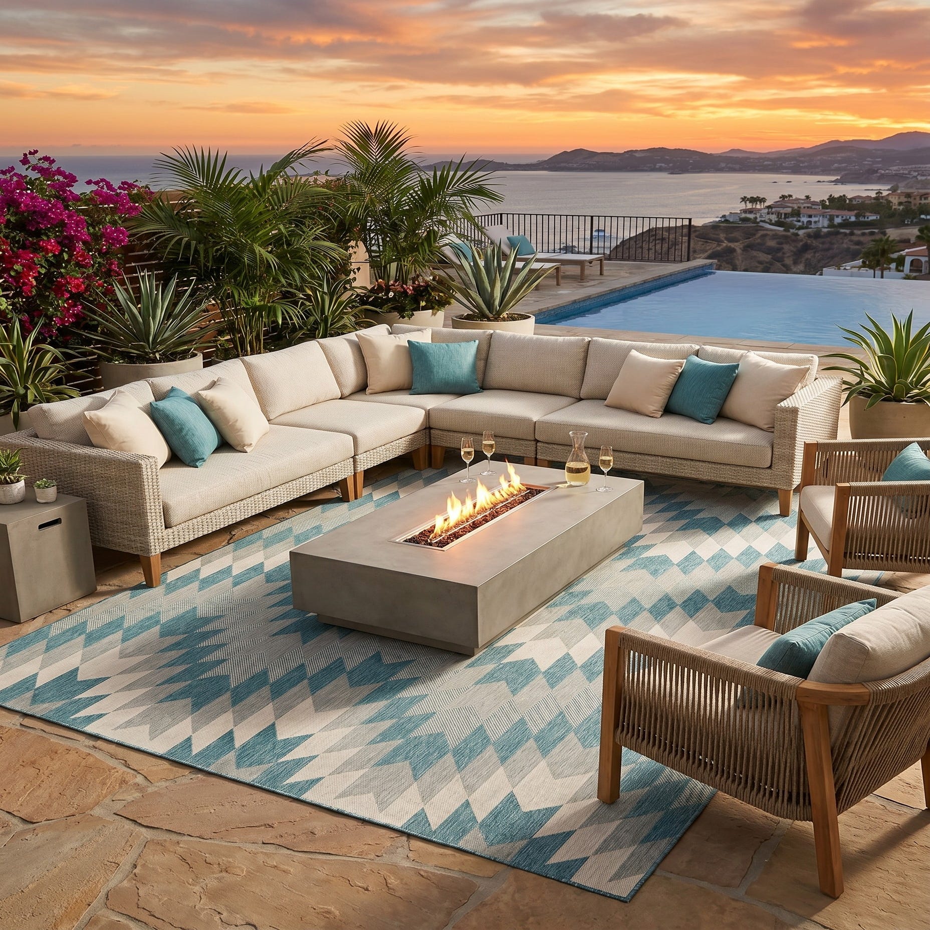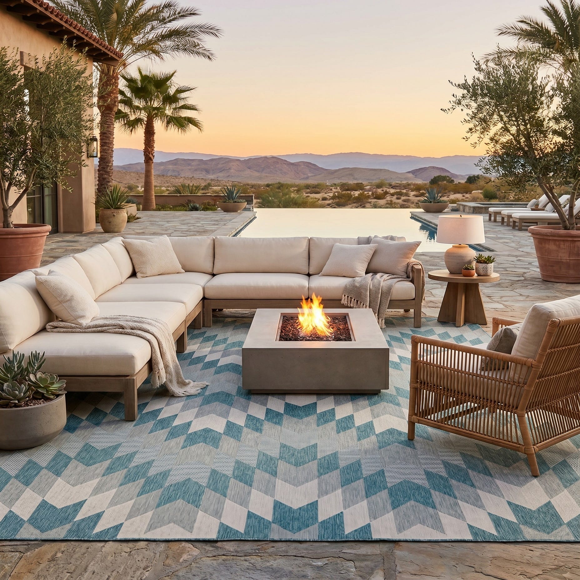 Love the contemporary look of this rug! We are so happy we chose this to accent the blue of our pool with our living area on our lanai. We still are going to add a few more pillows but love the rug to add color.