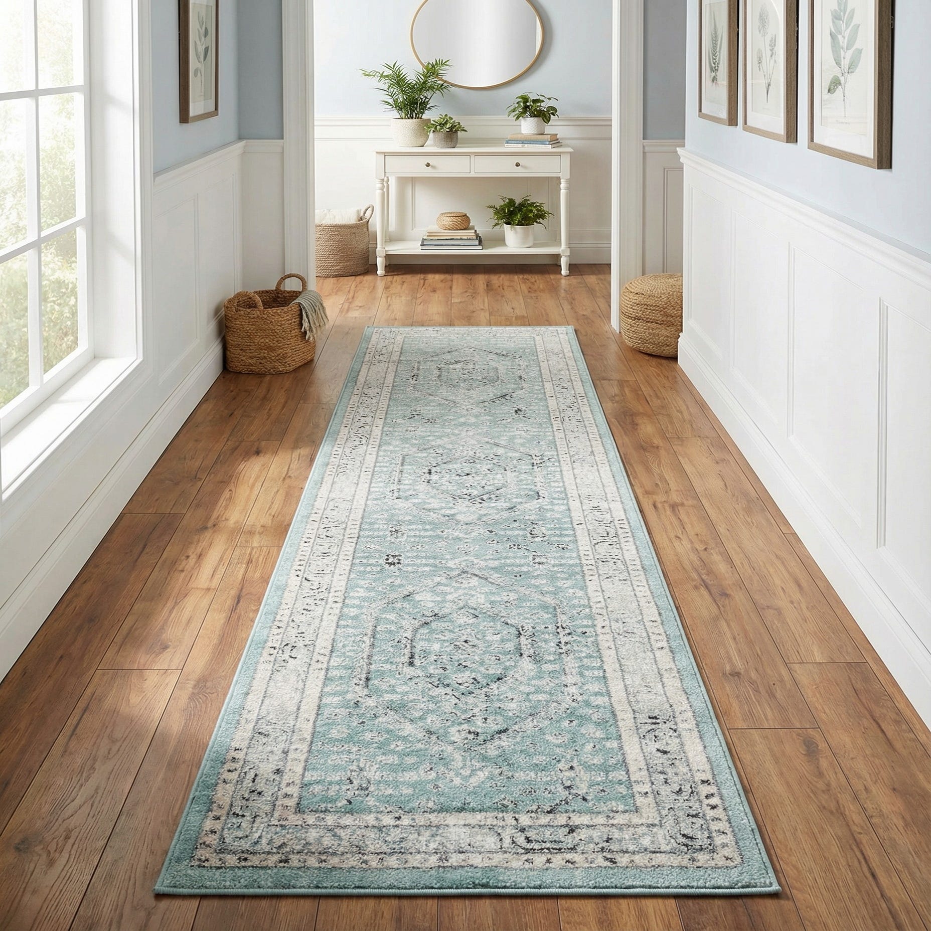 Primary color is Aqua. Colors in this rug include: Aqua, Gray, Ivory, Beige, Black.