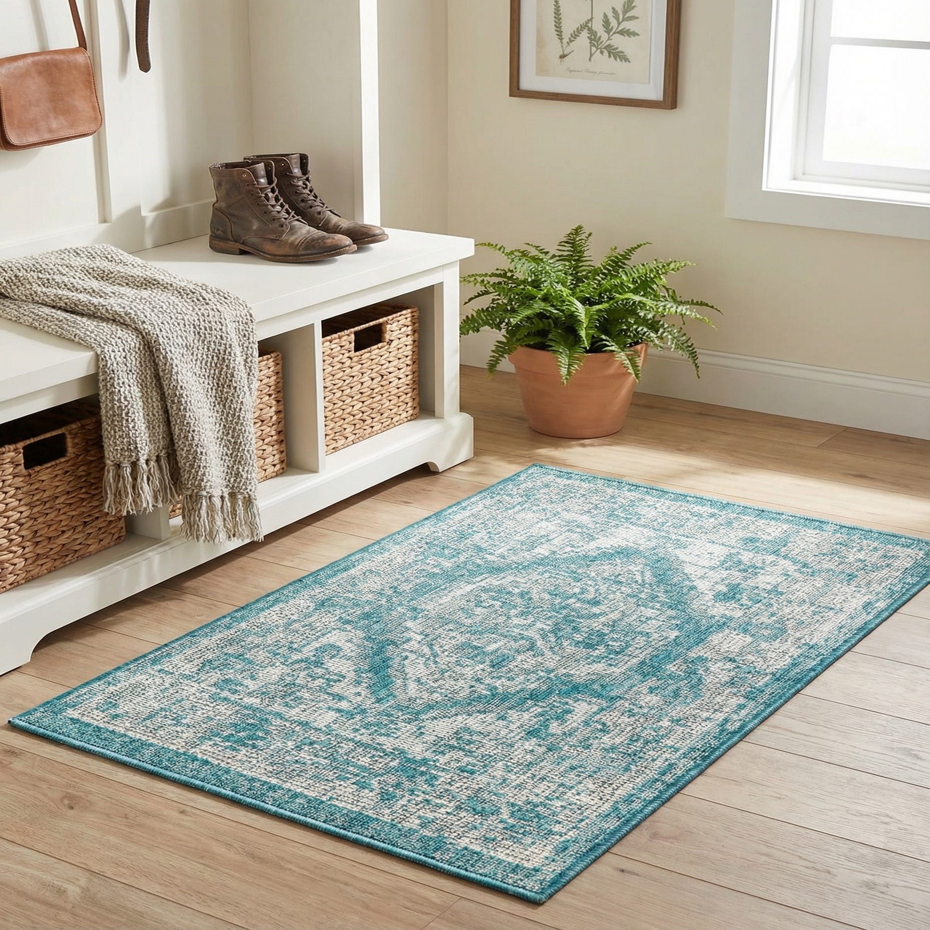 Primary color is Aqua. Colors in this rug include: Aqua, Ivory.
