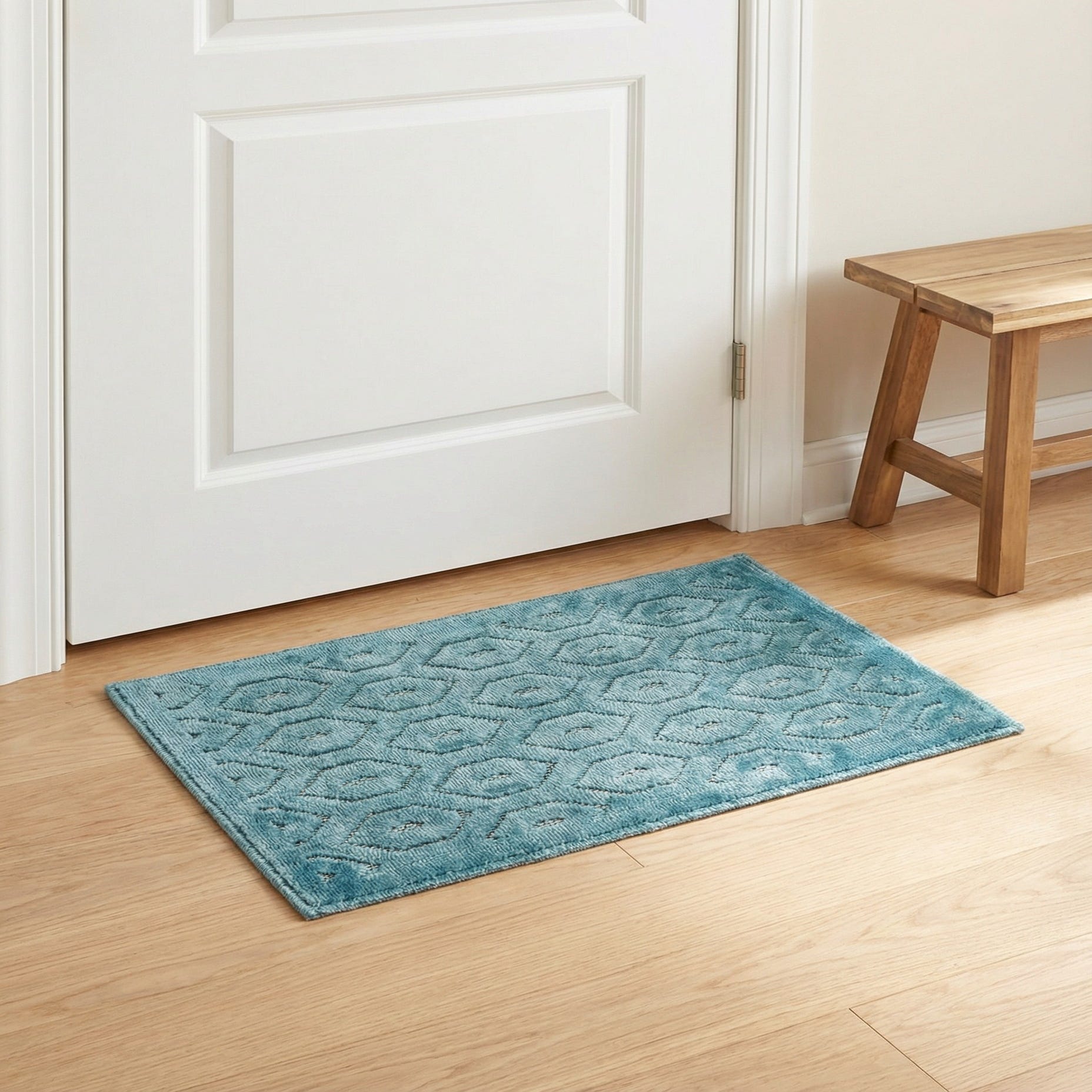 Primary color is Aqua. Colors in this rug include: Aqua, Ivory.