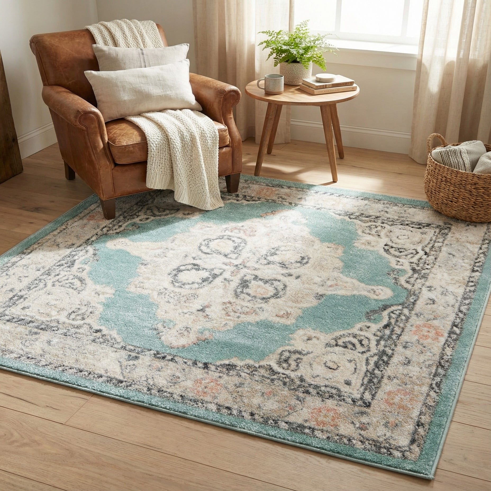 Primary color is Aqua. Colors in this rug include: Aqua, Beige, Gray, Ivory, Pink.