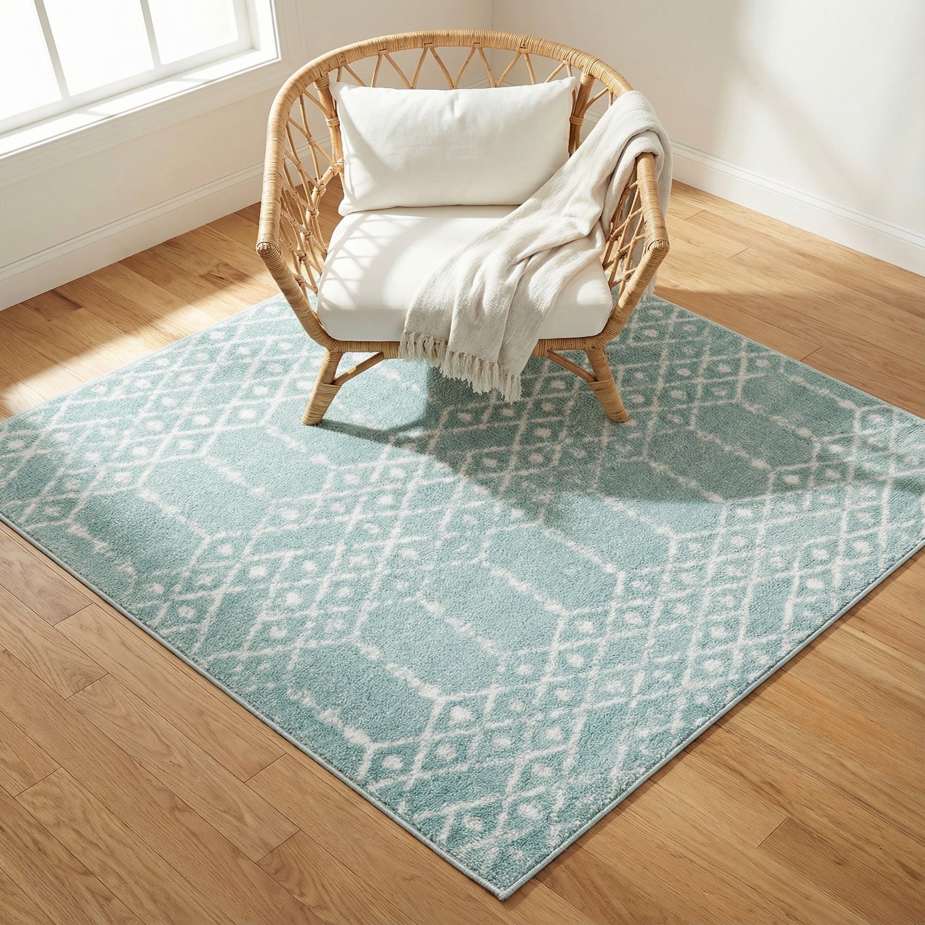 Primary color is Aqua. Colors in this rug include: Aqua, Ivory.