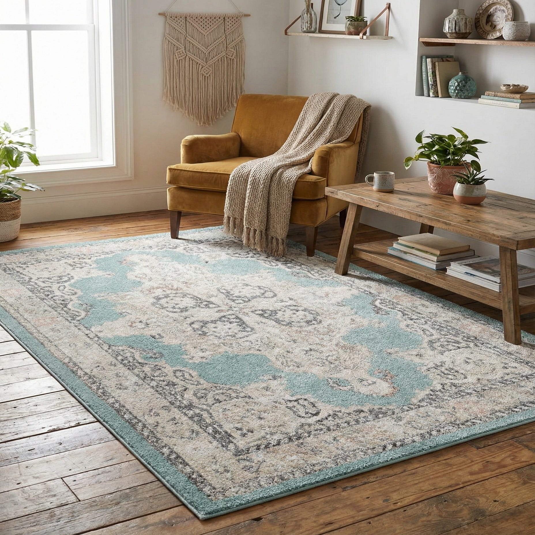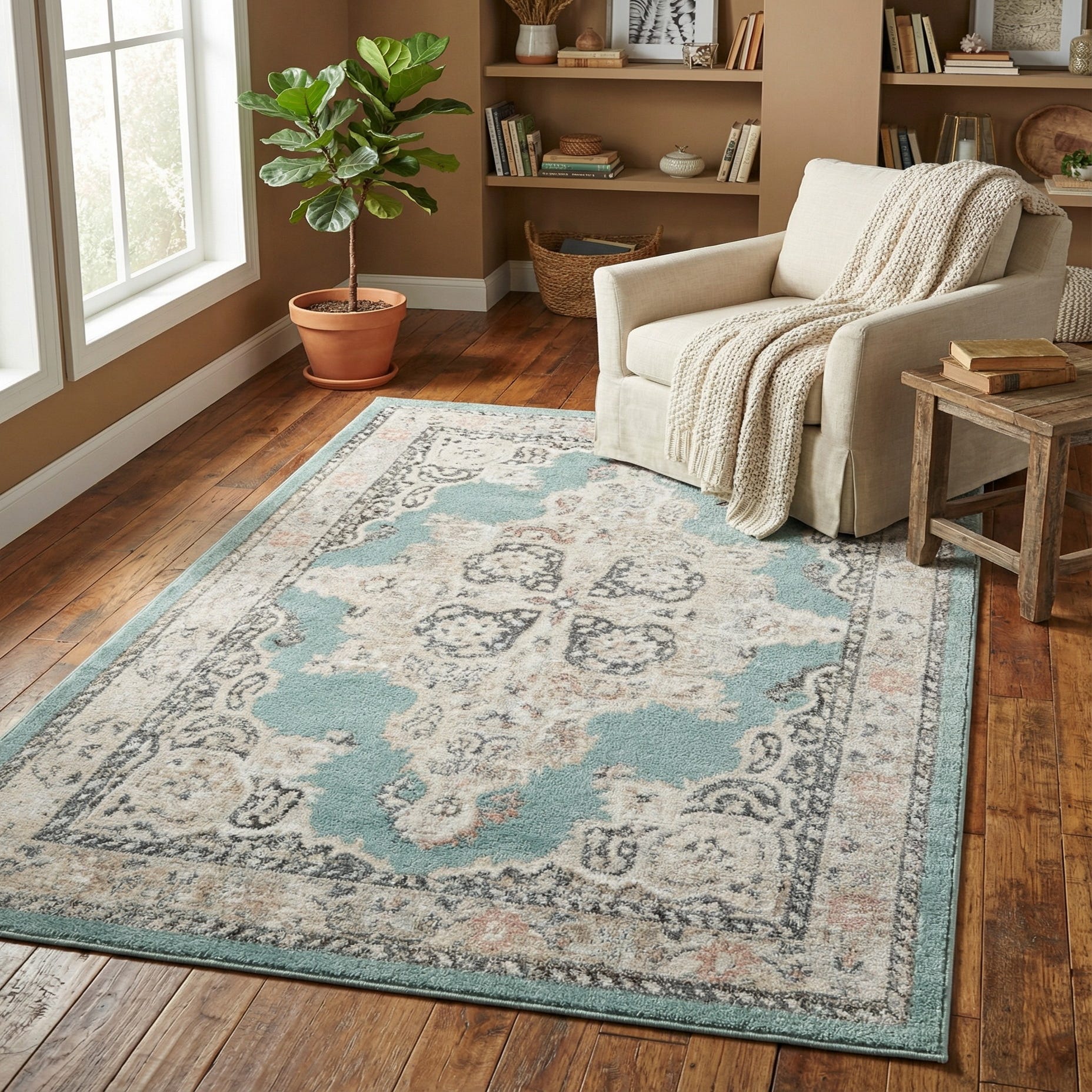 Primary color is Aqua. Colors in this rug include: Aqua, Beige, Gray, Ivory, Pink.