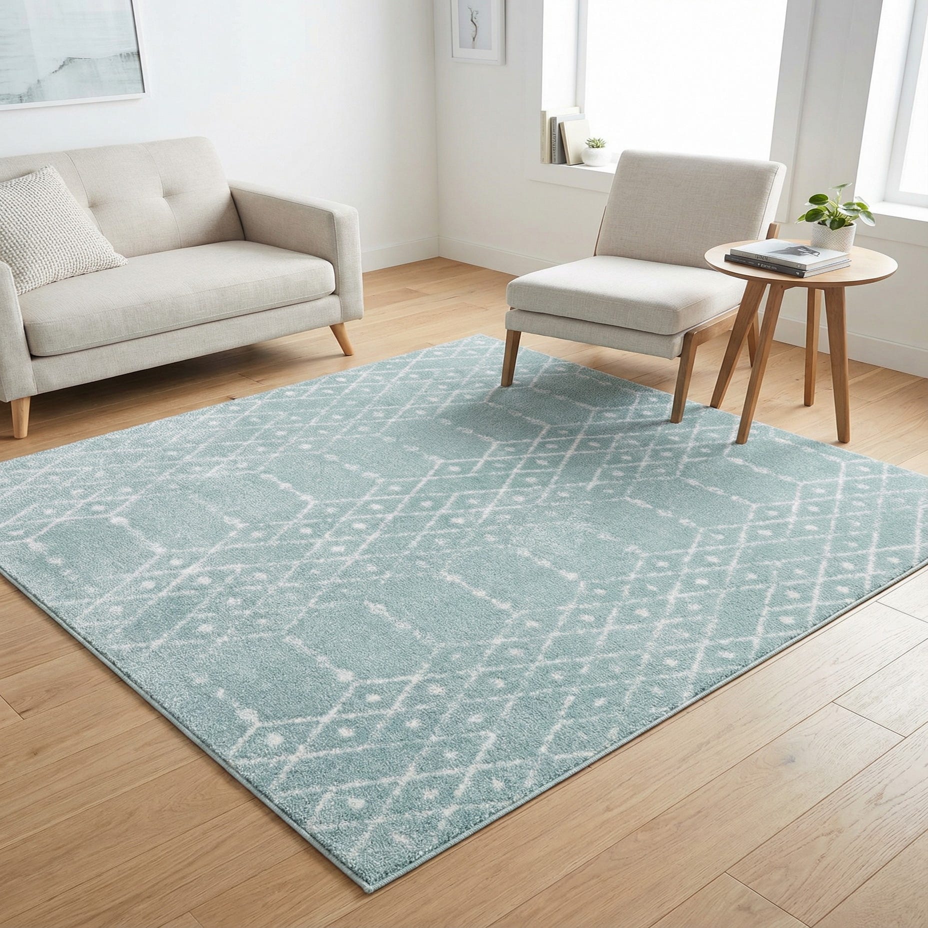 Primary color is Aqua. Colors in this rug include: Aqua, Ivory.