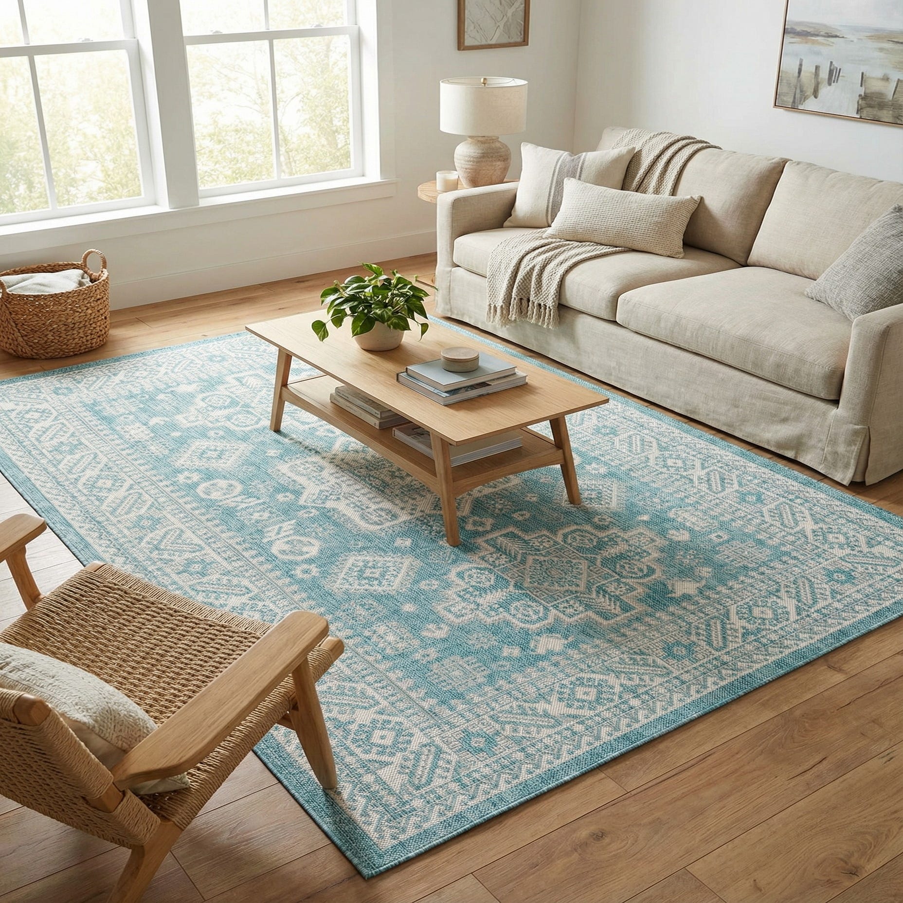 Primary color is Aqua. Colors in this rug include: Aqua, Gray, Ivory.