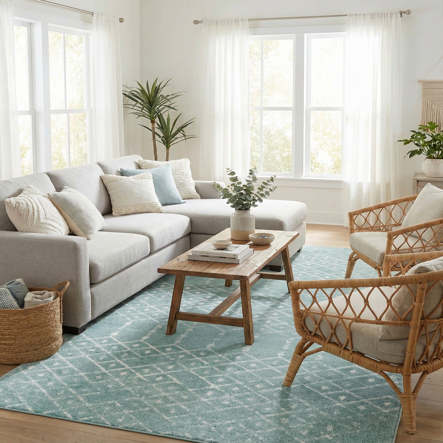 Primary color is Aqua. Colors in this rug include: Aqua, Ivory.