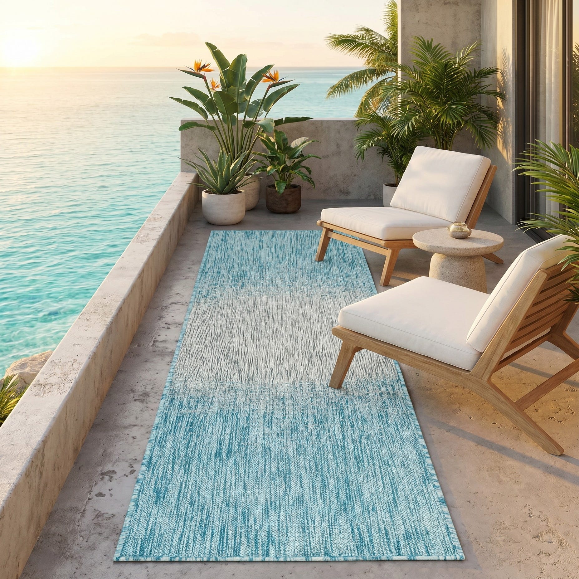 Love the contemporary look of this rug! We are so happy we chose this to accent the blue of our pool with our living area on our lanai. We still are going to add a few more pillows but love the rug to add color.