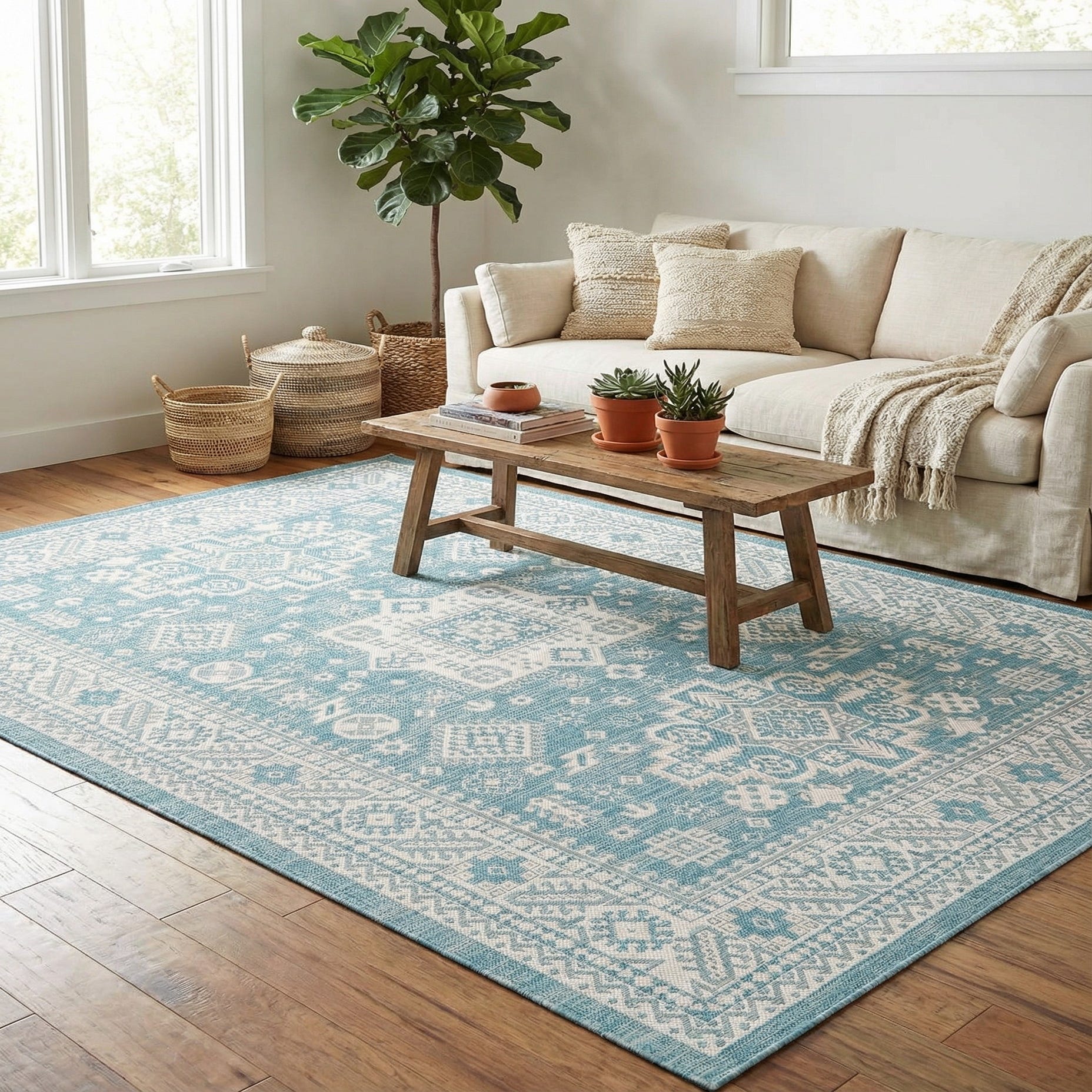Primary color is Aqua. Colors in this rug include: Aqua, Ivory.