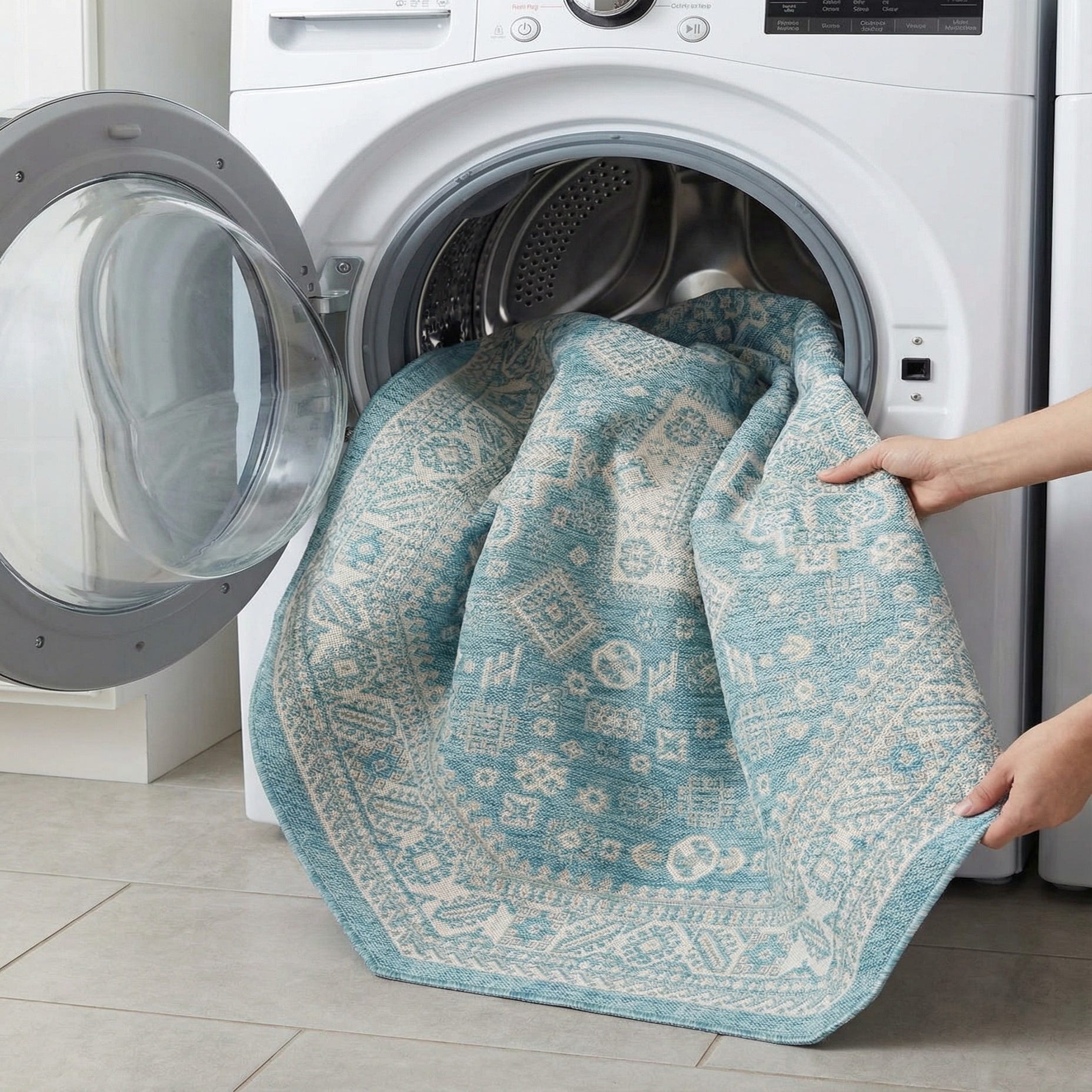 Primary color is Aqua. Colors in this rug include: Aqua, Blue, Ivory.