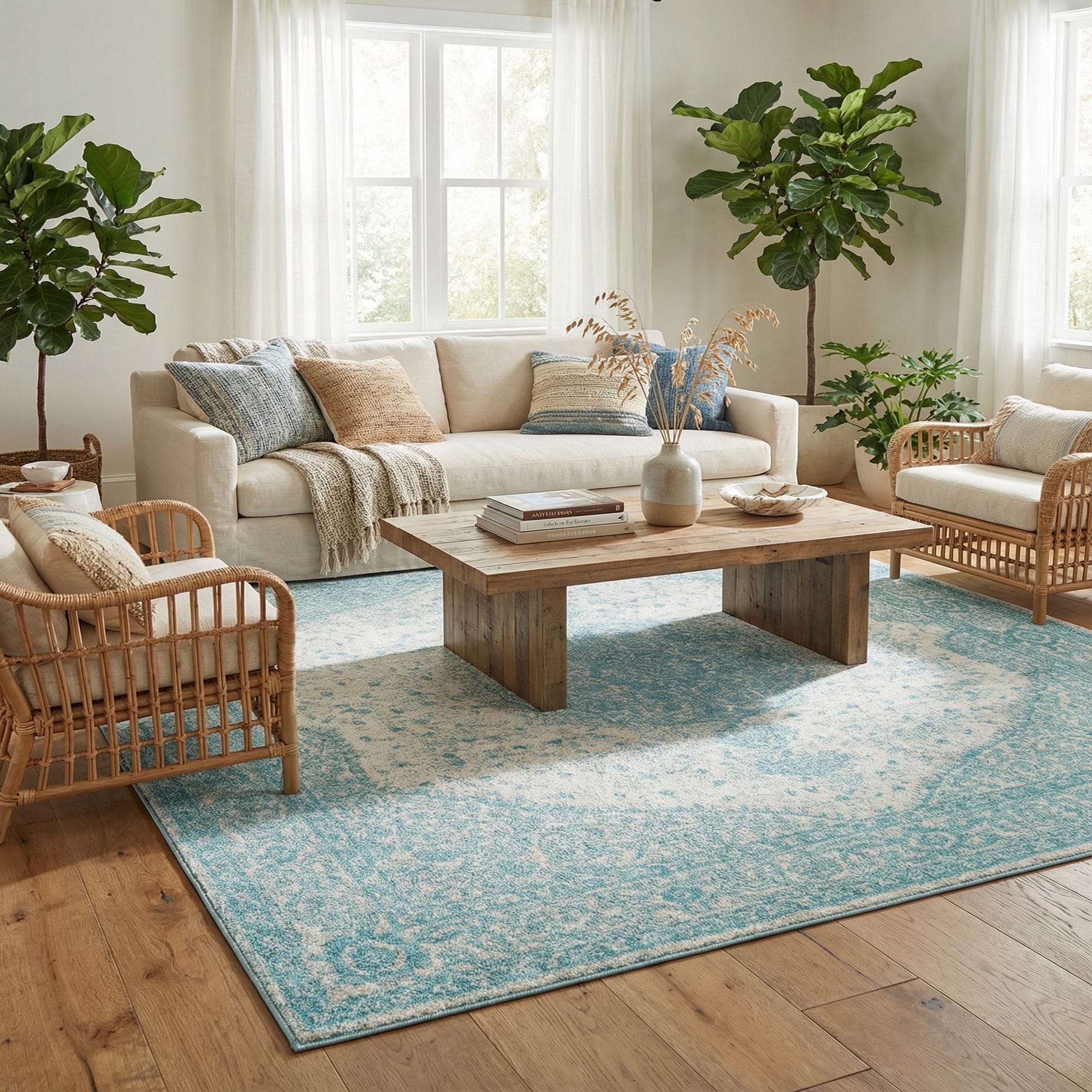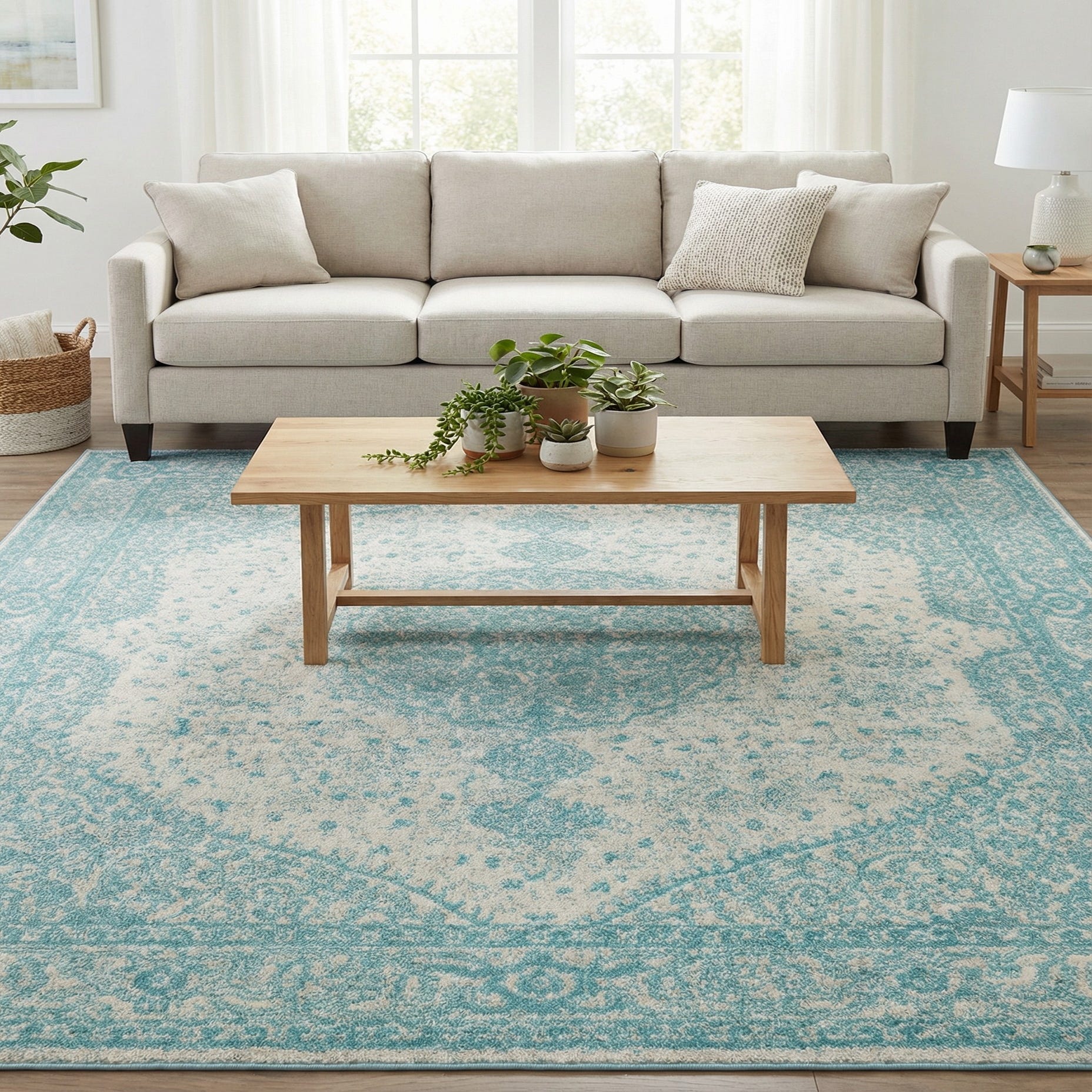 Primary color is Aqua. Colors in this rug include: Aqua, Ivory.