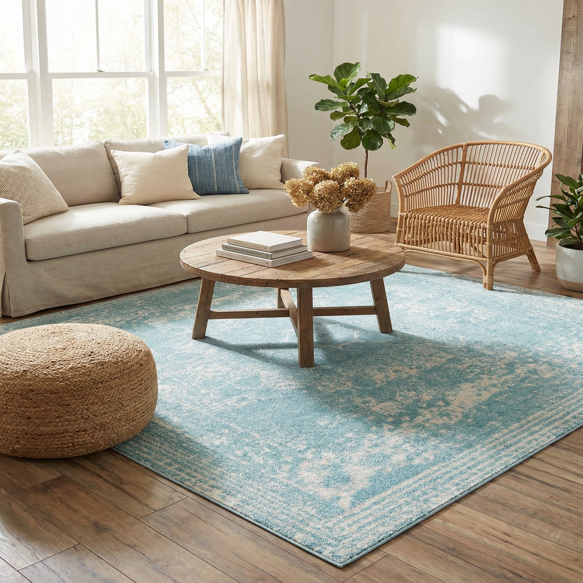 Primary color is Aqua. Colors in this rug include: Aqua, Ivory.