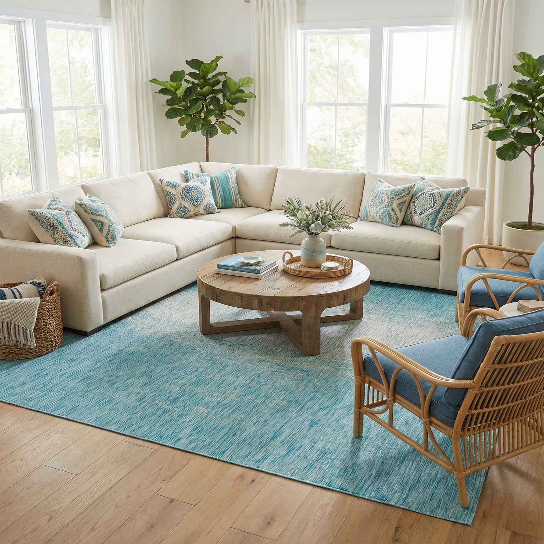 Primary color is Aqua. Colors in this rug include: Aqua, Gray, Ivory.