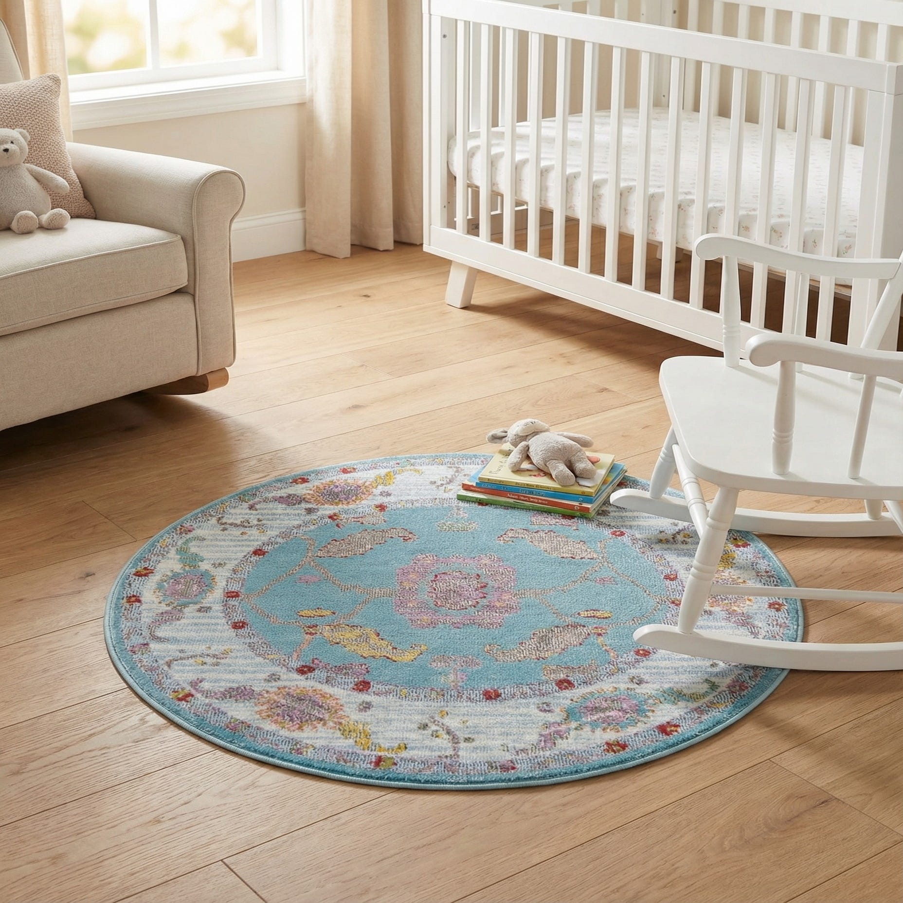 Primary color is Aqua and Blue. Colors in this rug include: Aqua and Blue, Beige, Gray, Green, Ivory, Yellow, Pink, Orange, Red.