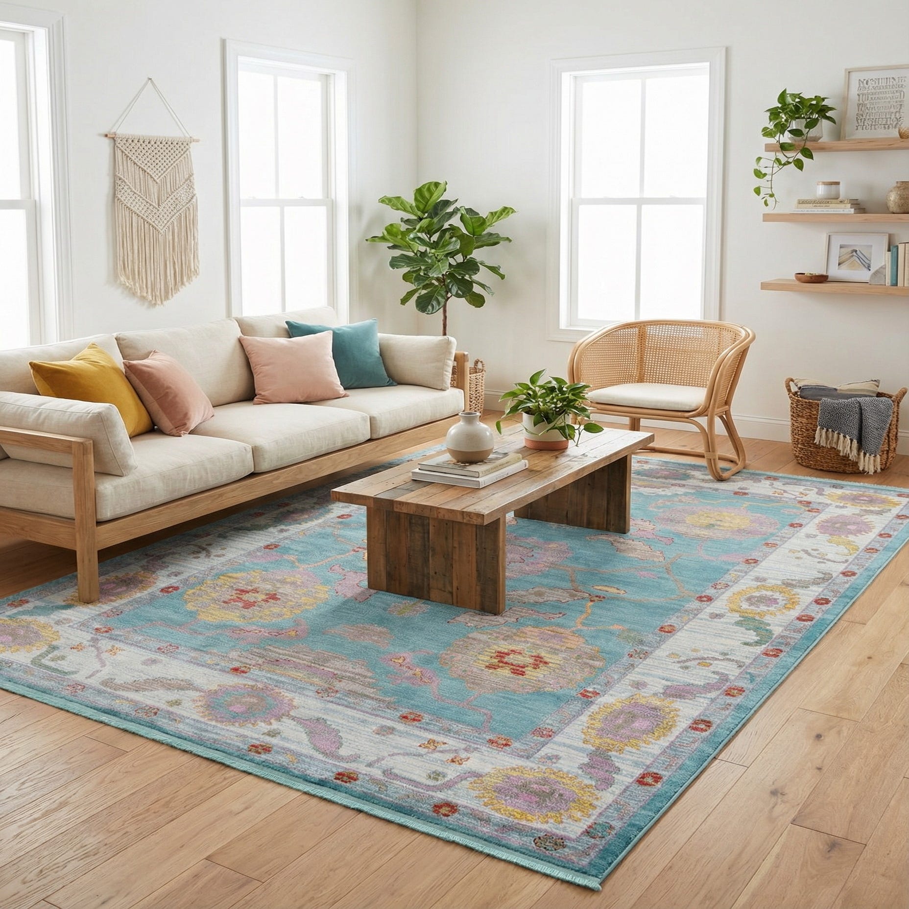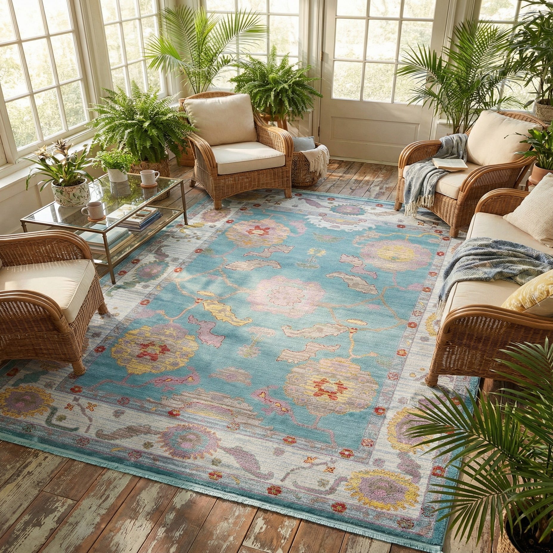 Primary color is Aqua and Blue. Colors in this rug include: Aqua and Blue, Beige, Gray, Green, Ivory, Orange, Red, Pink, Yellow.