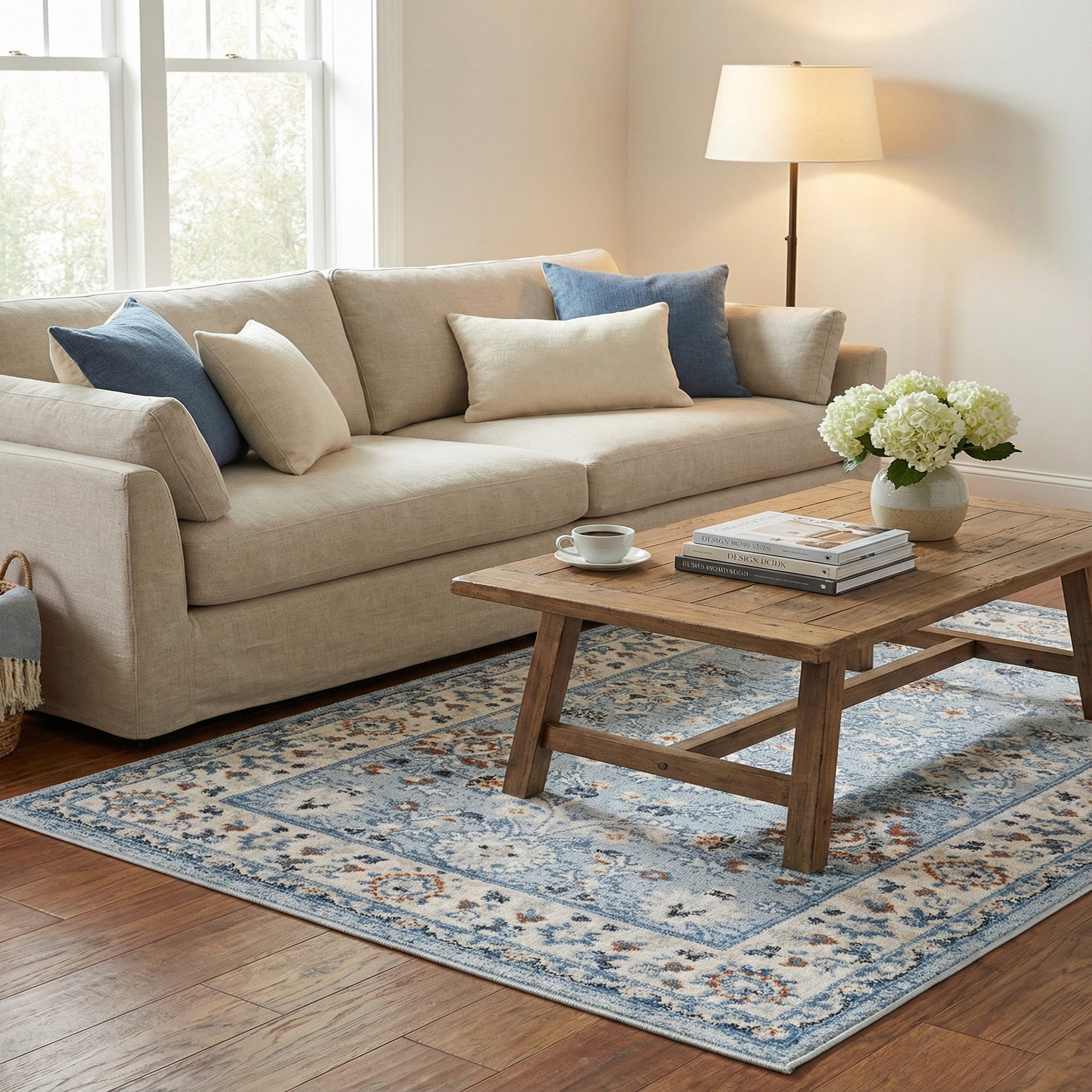 Primary color is Aqua Blue. Colors in this rug include: Aqua Blue, Beige, Blue, Brown, Terracotta.