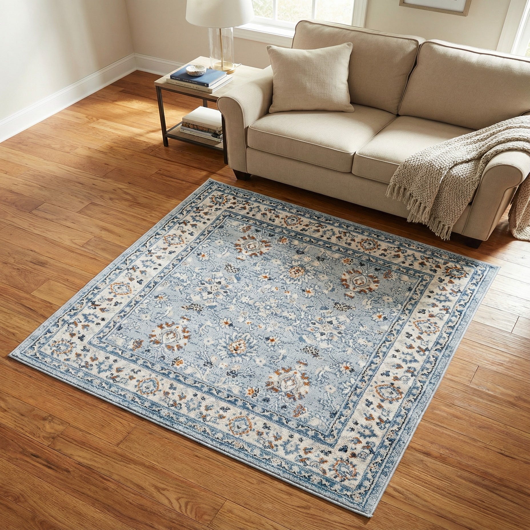 Primary color is Aqua Blue. Colors in this rug include: Aqua Blue, Beige, Blue, Brown, Terracotta.