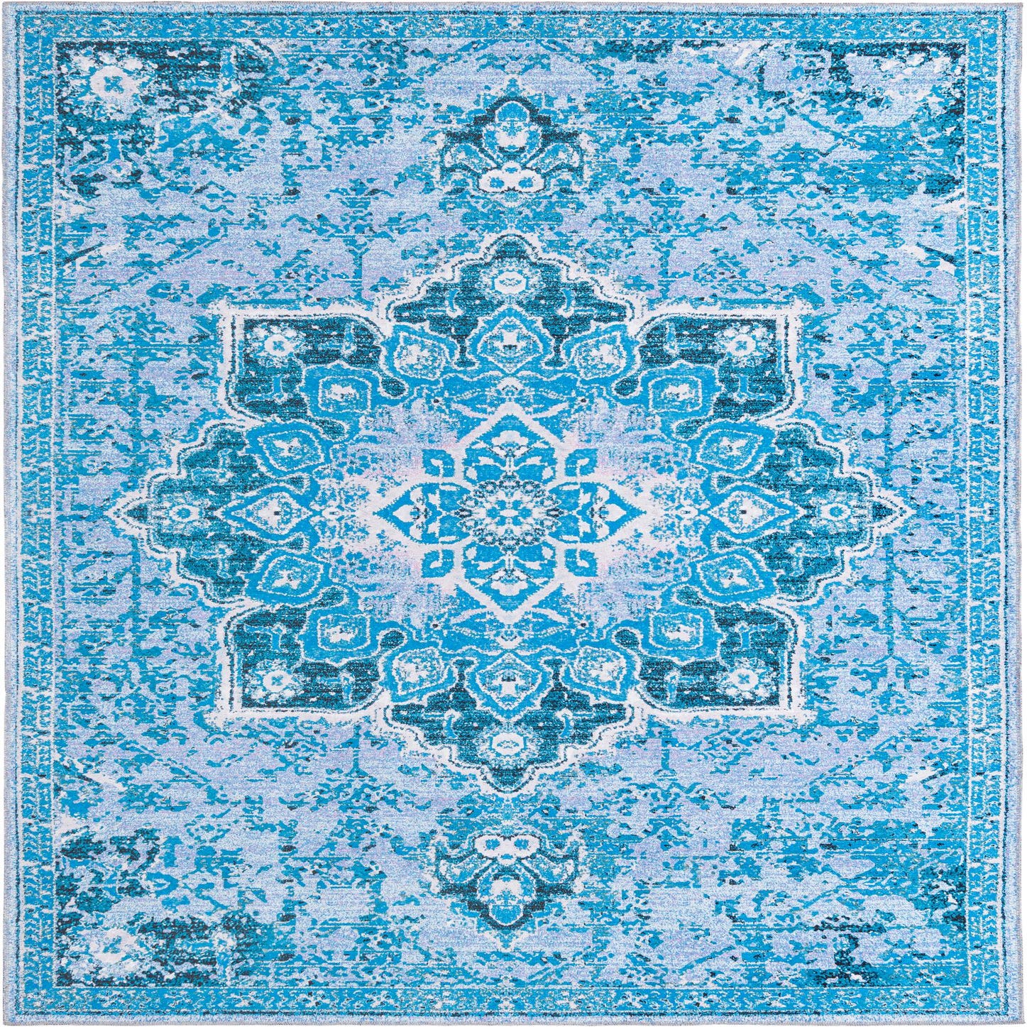 Primary color is Aqua Blue. Colors in this rug include: Aqua Blue, Ivory, Light Blue, Navy Blue.