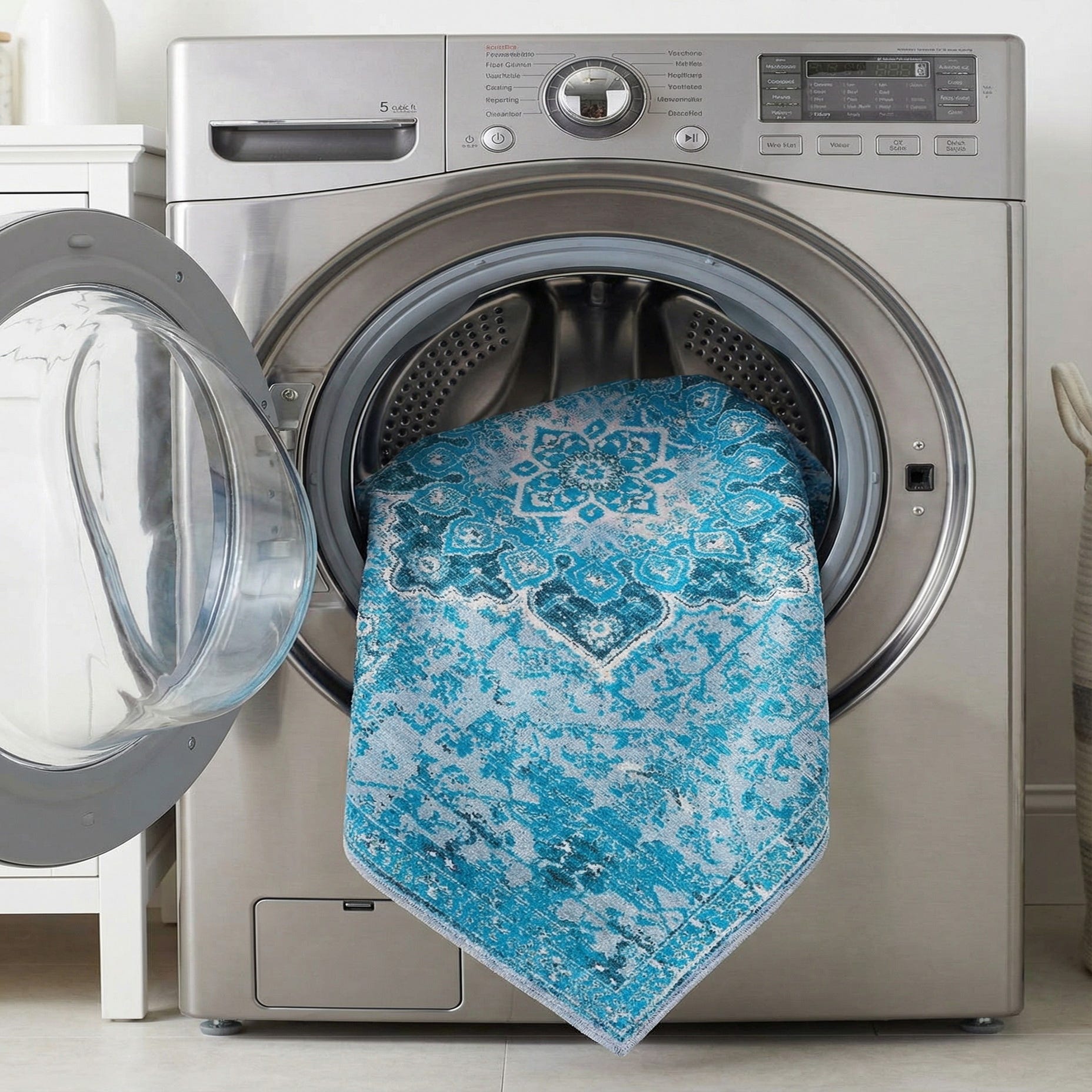 Primary color is Aqua Blue. Colors in this rug include: Aqua Blue, Light Blue, Ivory, Navy Blue.