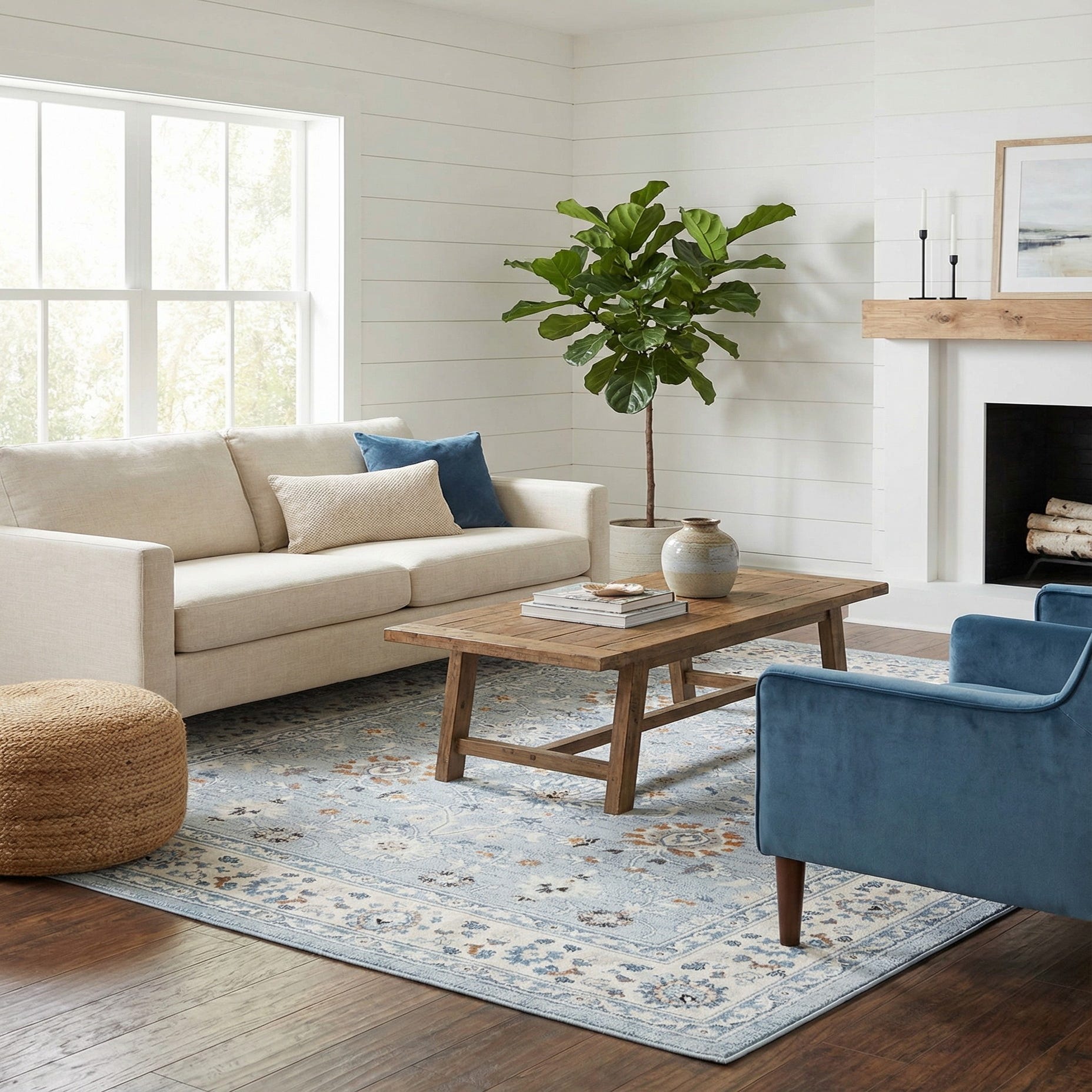 Primary color is Aqua Blue. Colors in this rug include: Aqua Blue, Beige, Blue, Brown, Terracotta.