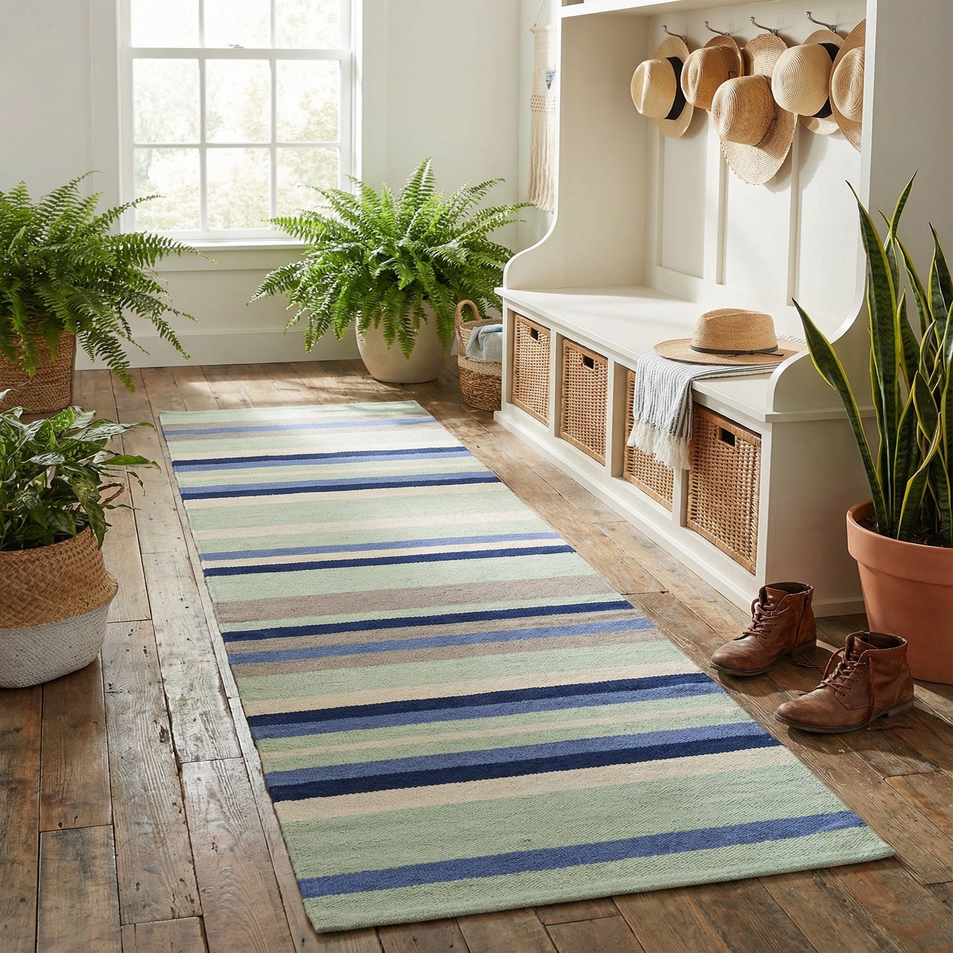 Primary color is Aqua Blue and Gray. Colors in this rug include: Aqua Blue and Gray, Blue, Navy Blue, Light Green, Ivory.