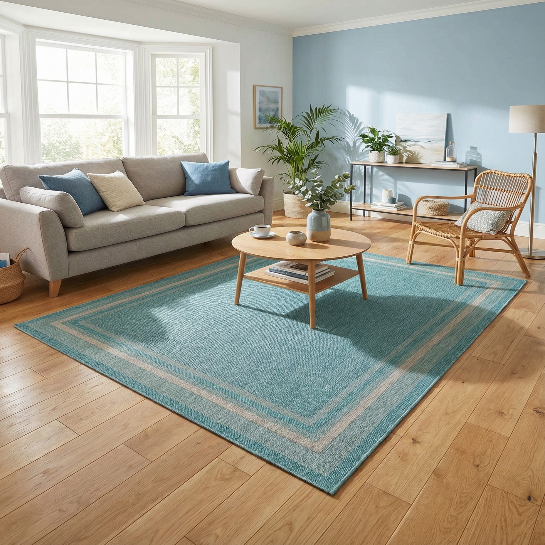 Primary color is Aquamarine. Colors in this rug include: Aquamarine, Ivory.