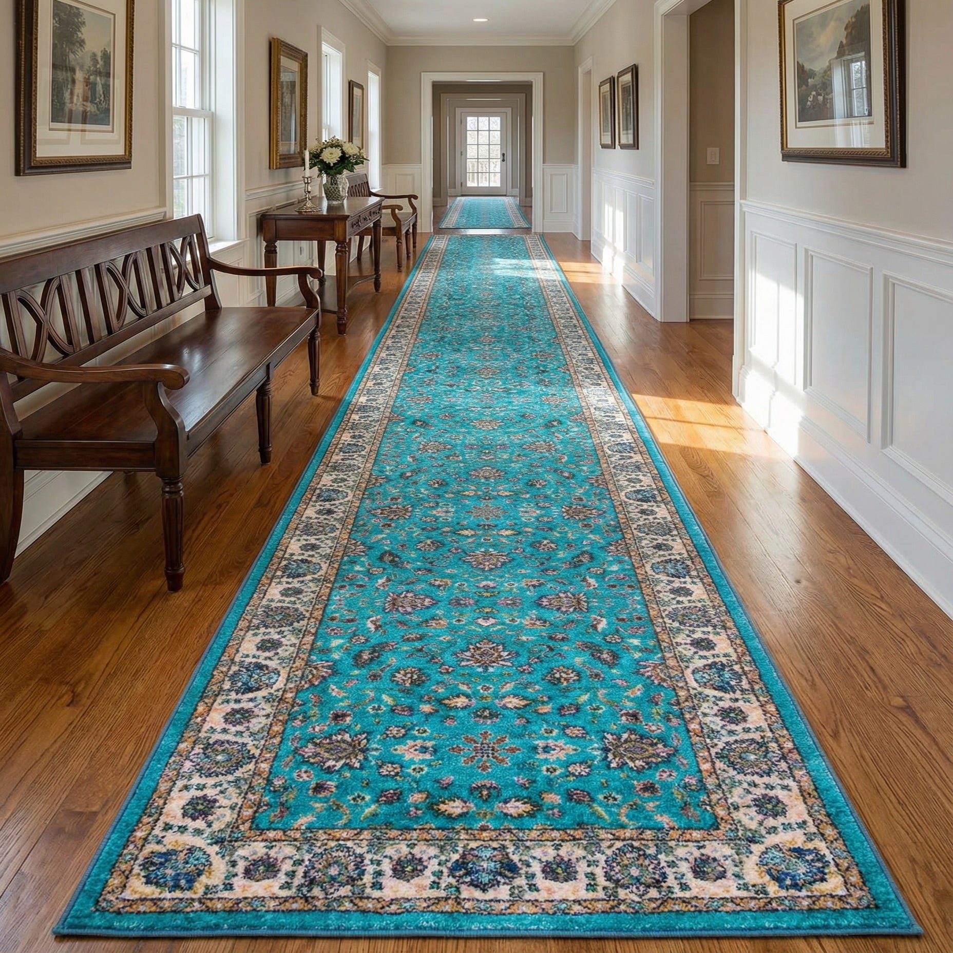 Primary color is Arctic Aqua Blue. Colors in this rug include: Arctic Aqua Blue, Black, Ivory, Light Blue, Olive, Yellow, Gray.