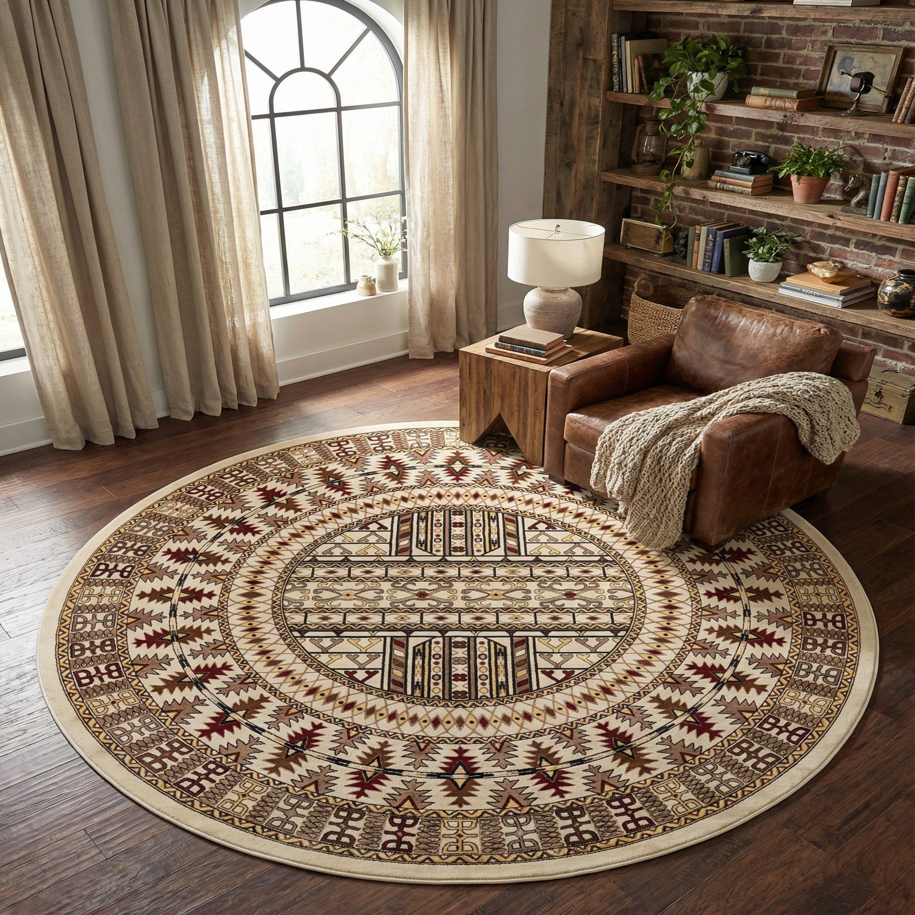 Primary color is Beige. Colors in this rug include: Beige, Black, Brown, Red, Yellow.