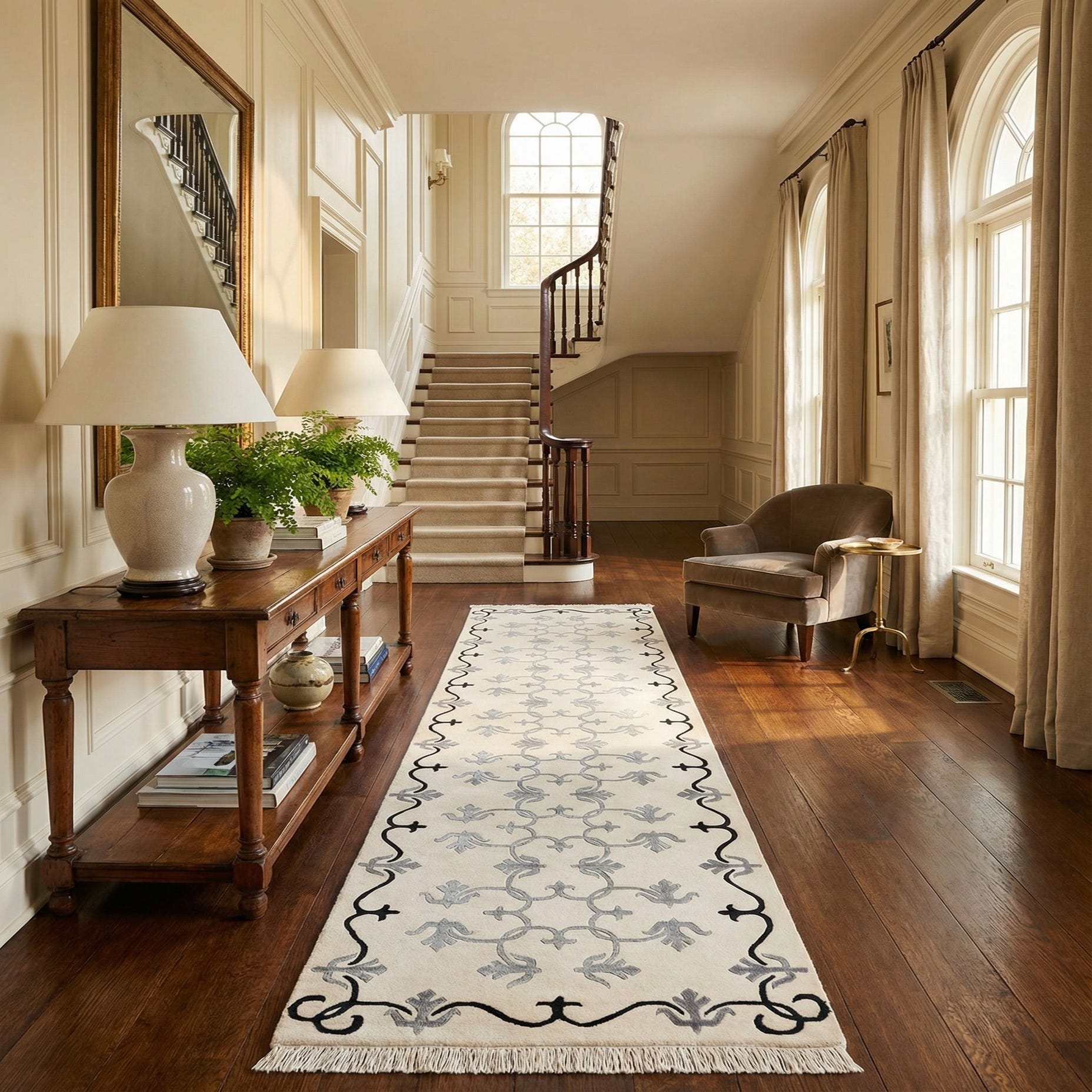 Primary color is Beige. Colors in this rug include: Beige, Black, Gray, Silver.
