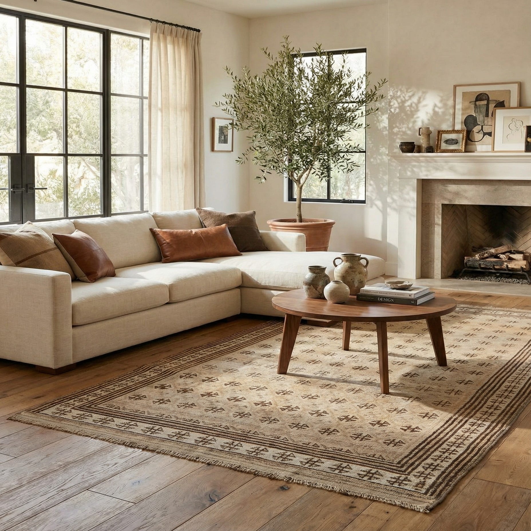 Primary color is Beige. Colors in this rug include: Beige, Brown.