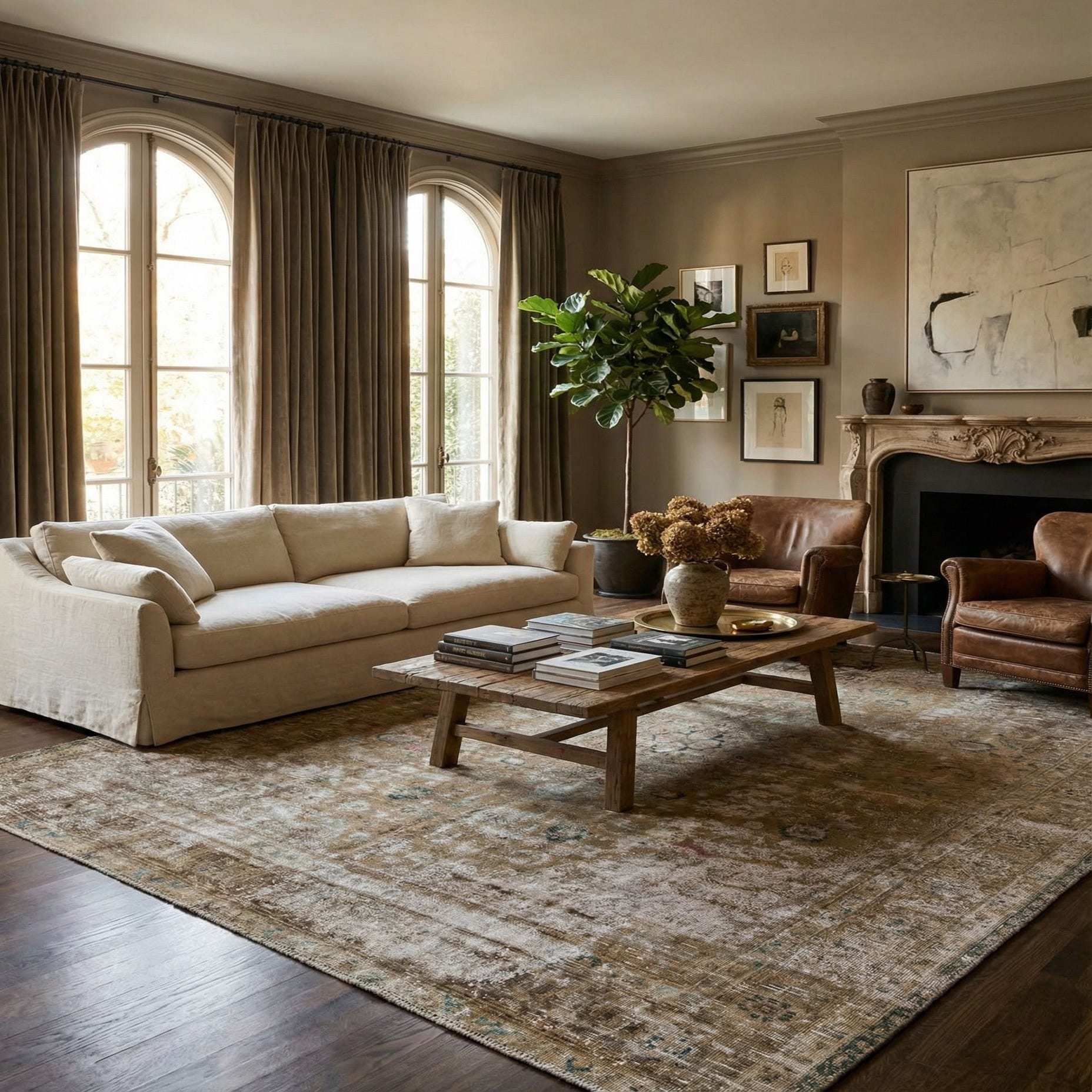 Primary color is Beige. Colors in this rug include: Beige, Brown, Navy Blue.