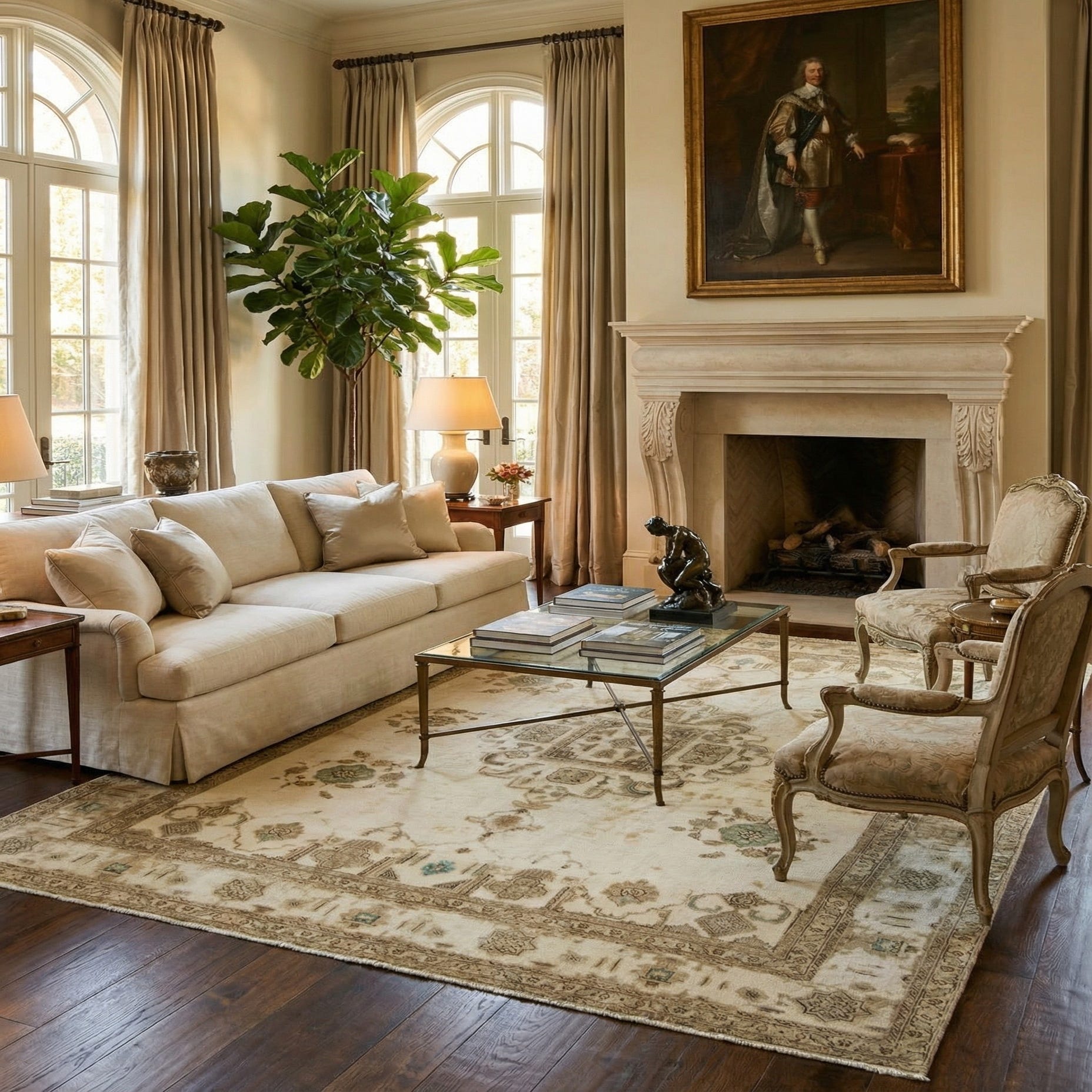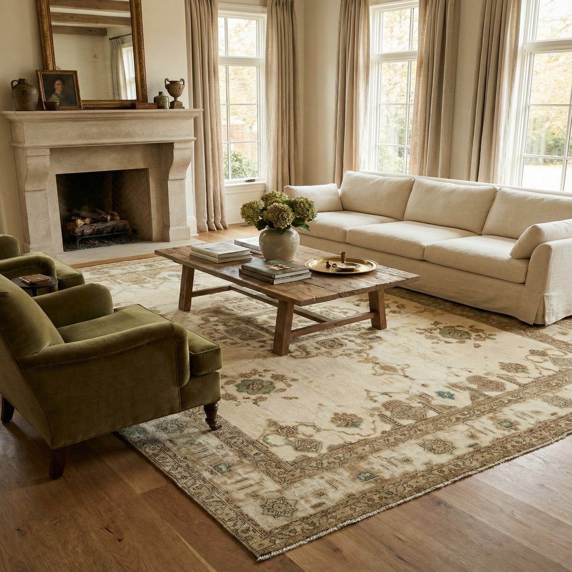 Primary color is Beige. Colors in this rug include: Beige, Brown, Green, Cream.