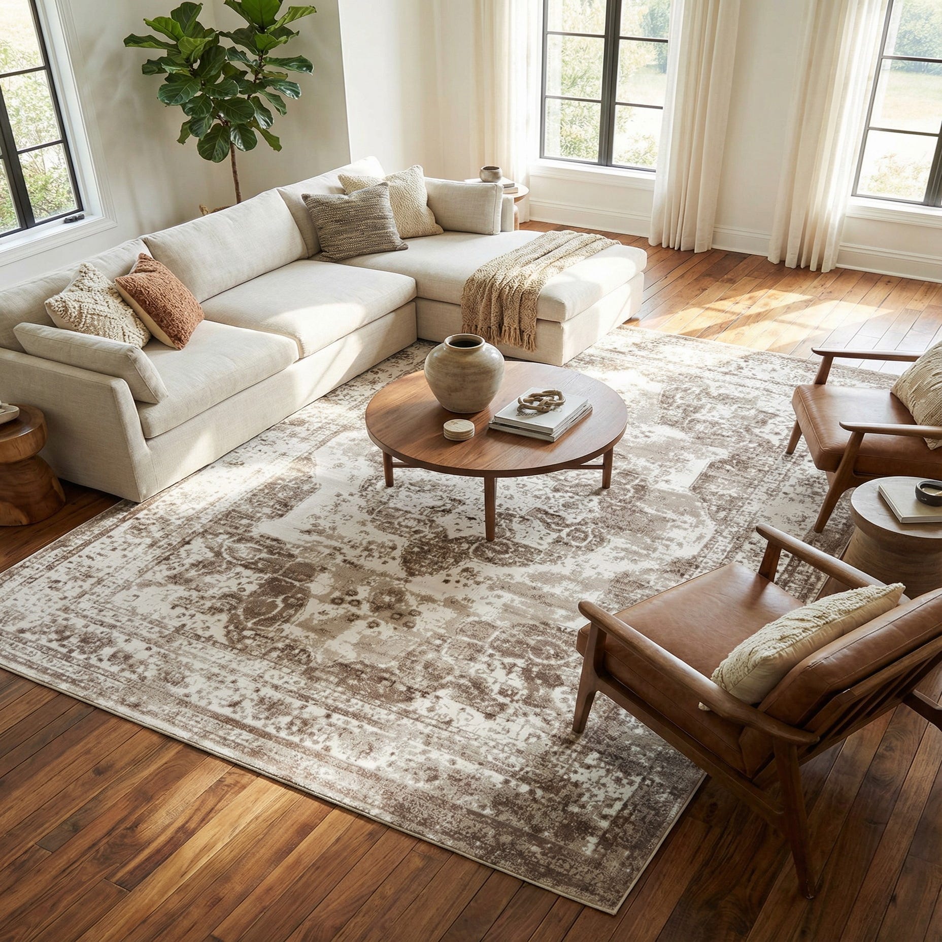 Primary color is Beige. Colors in this rug include: Beige, Brown, Ivory.