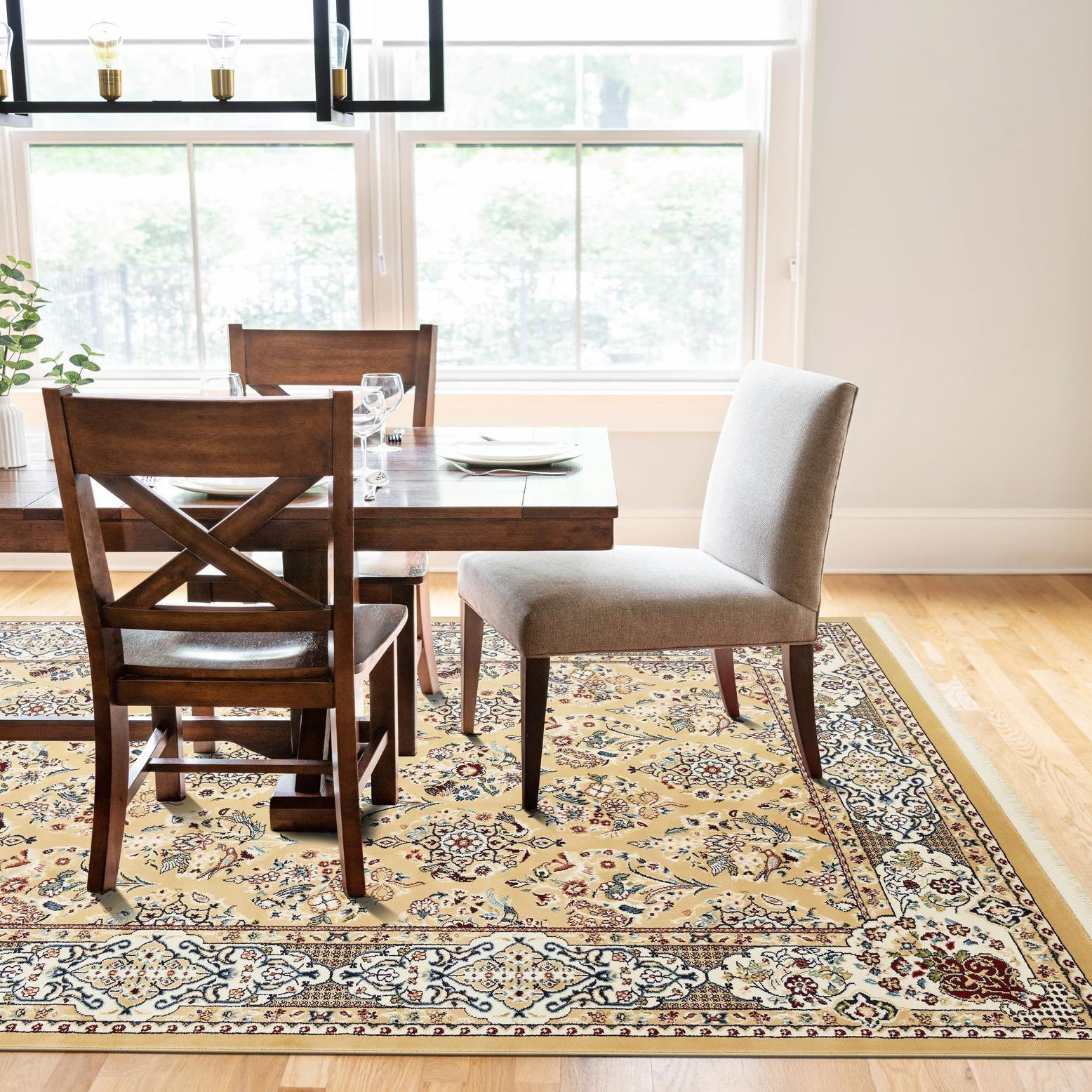 Primary color is Beige. Colors in this rug include: Beige, Blue, Burgundy, Cream, Green, Ivory, Navy Blue, Puce.