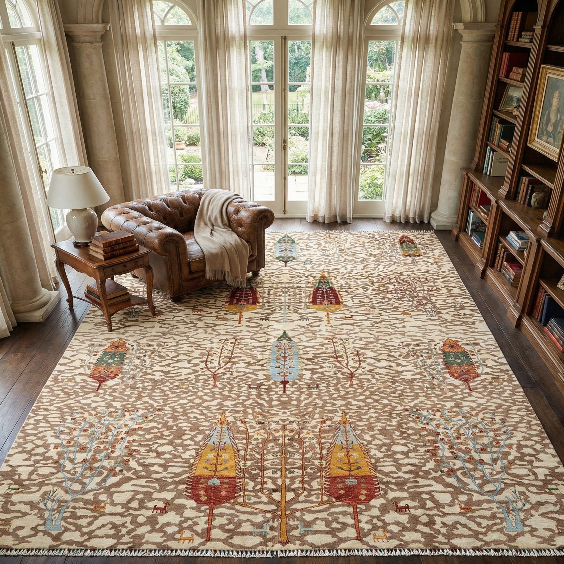 Primary color is Beige. Colors in this rug include: Beige, Beige, Brown, Blue, Red, Yellow, Cream.