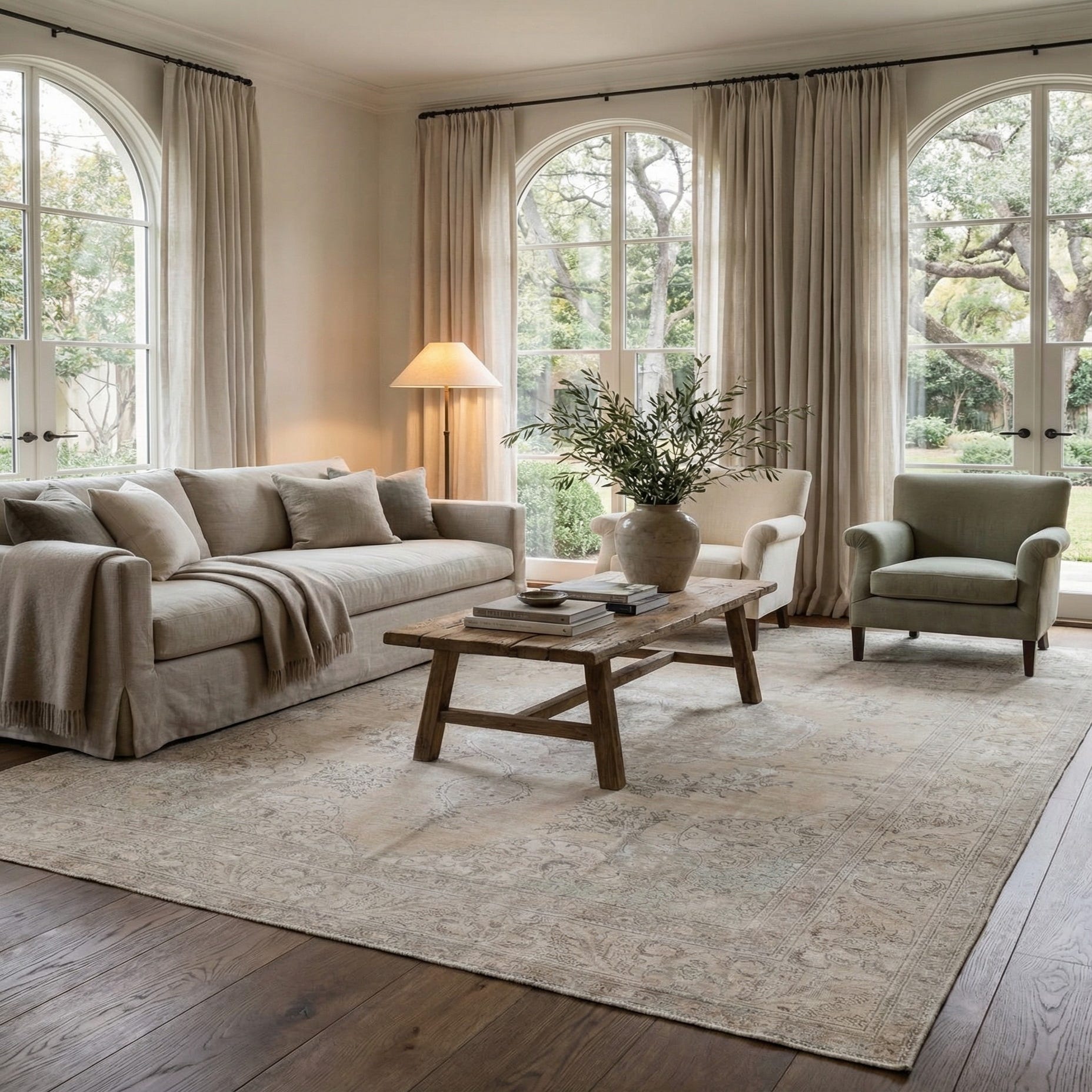Primary color is Beige. Colors in this rug include: Beige, Brown, Ivory, Green.