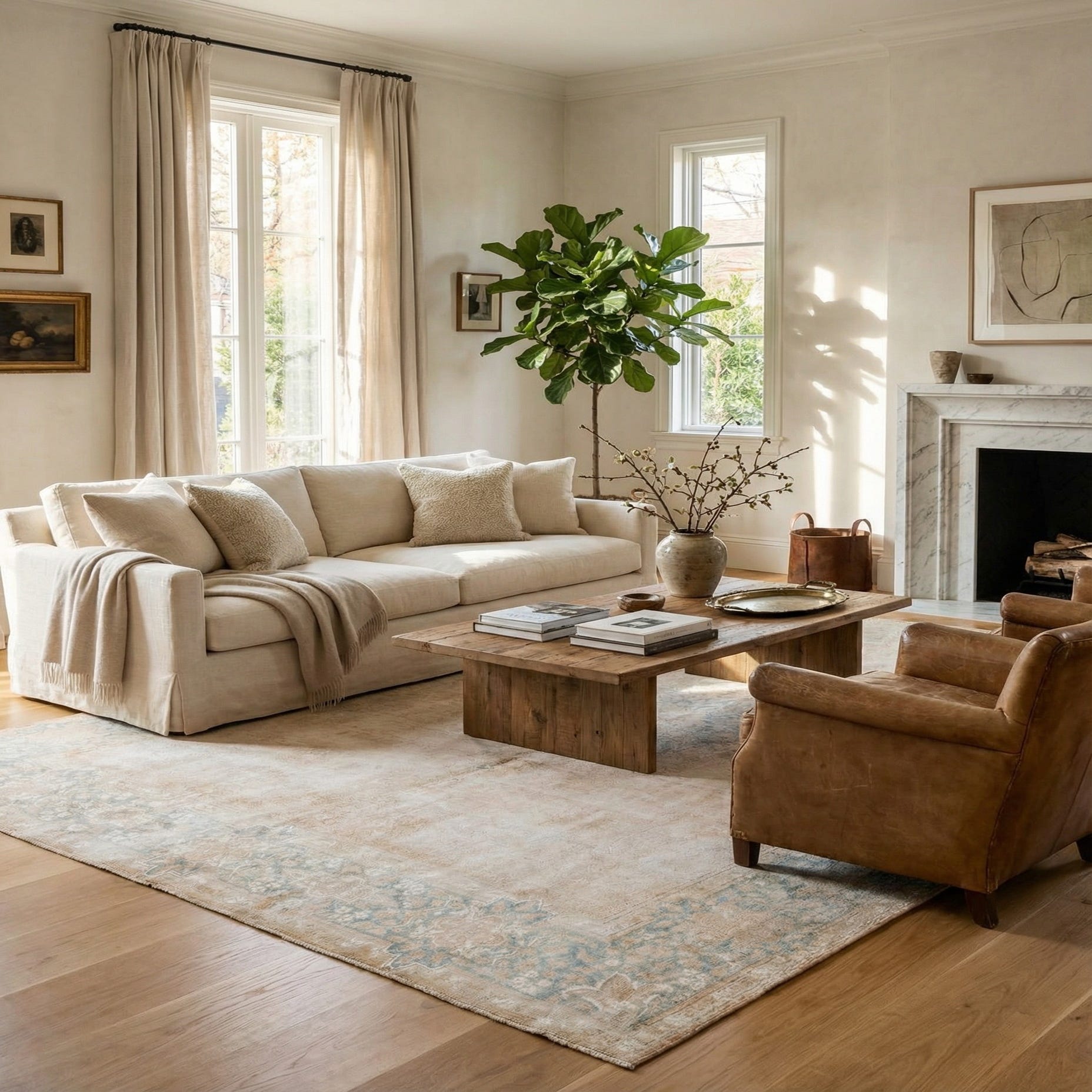 Primary color is Beige. Colors in this rug include: Beige, Brown, Ivory, Navy Blue.