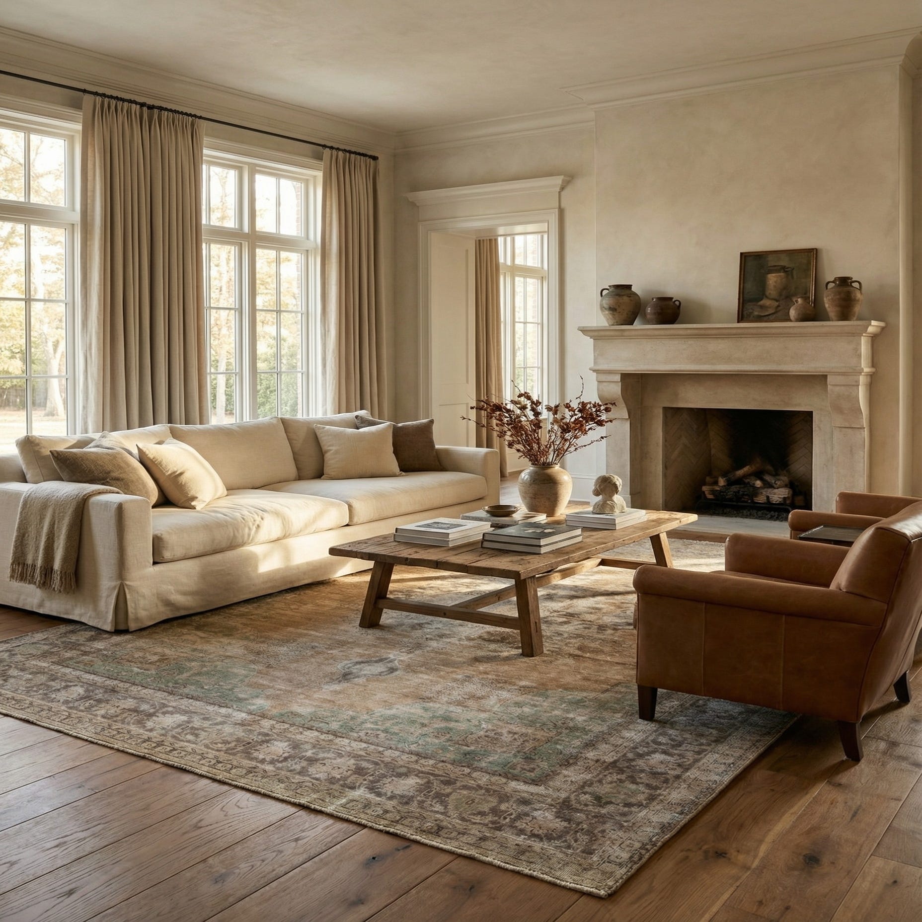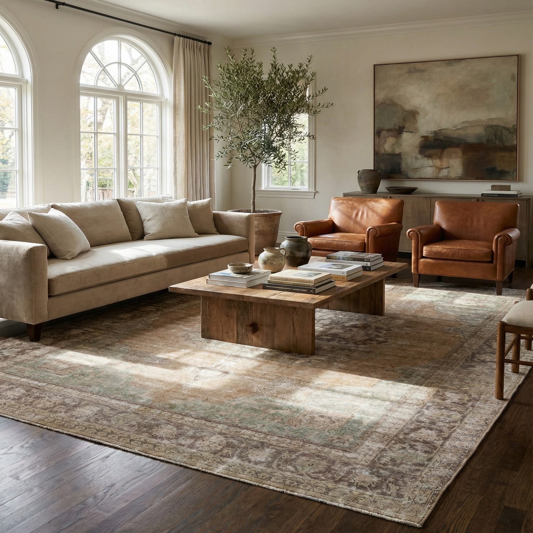 Primary color is Beige. Colors in this rug include: Beige, Brown, Navy Blue, Ivory.