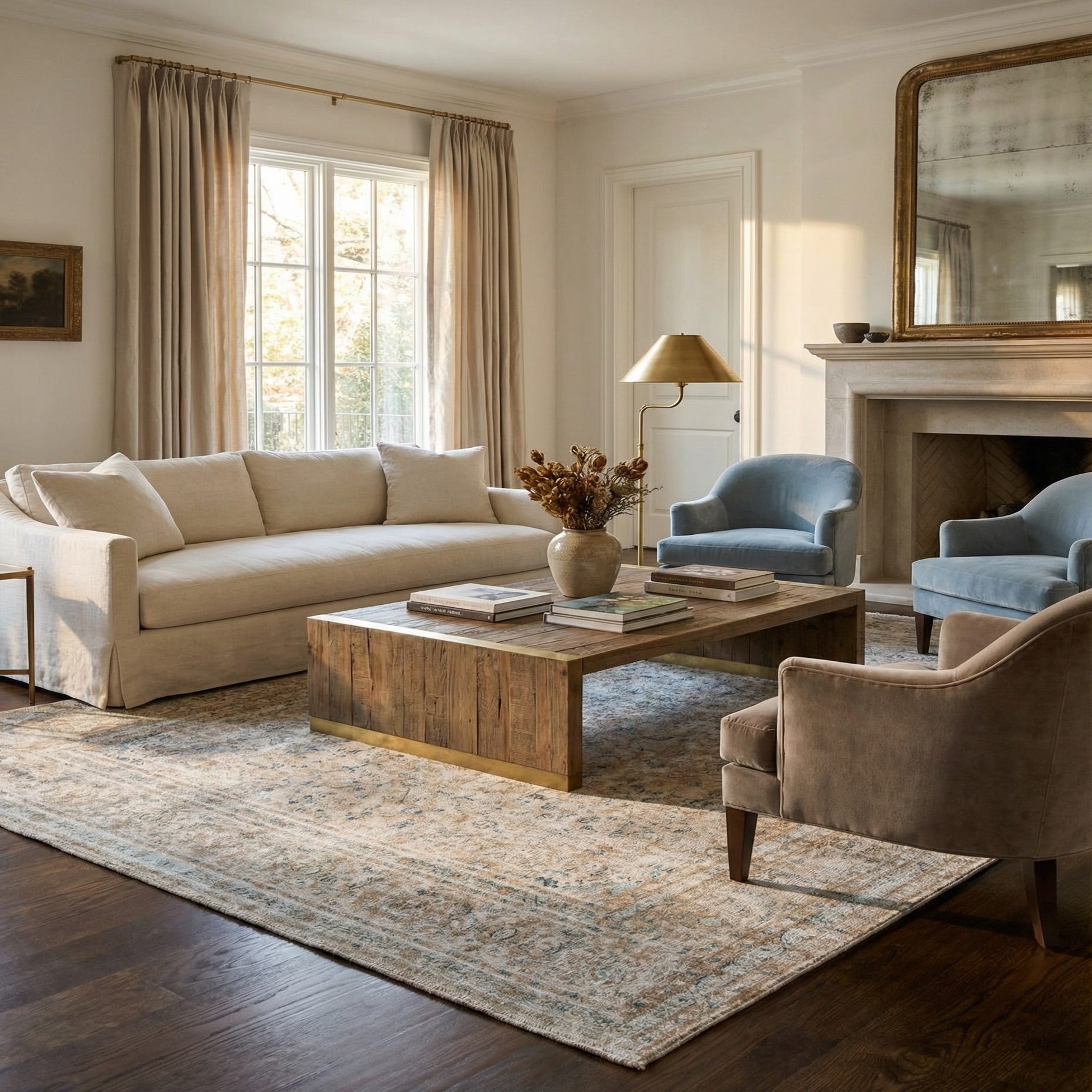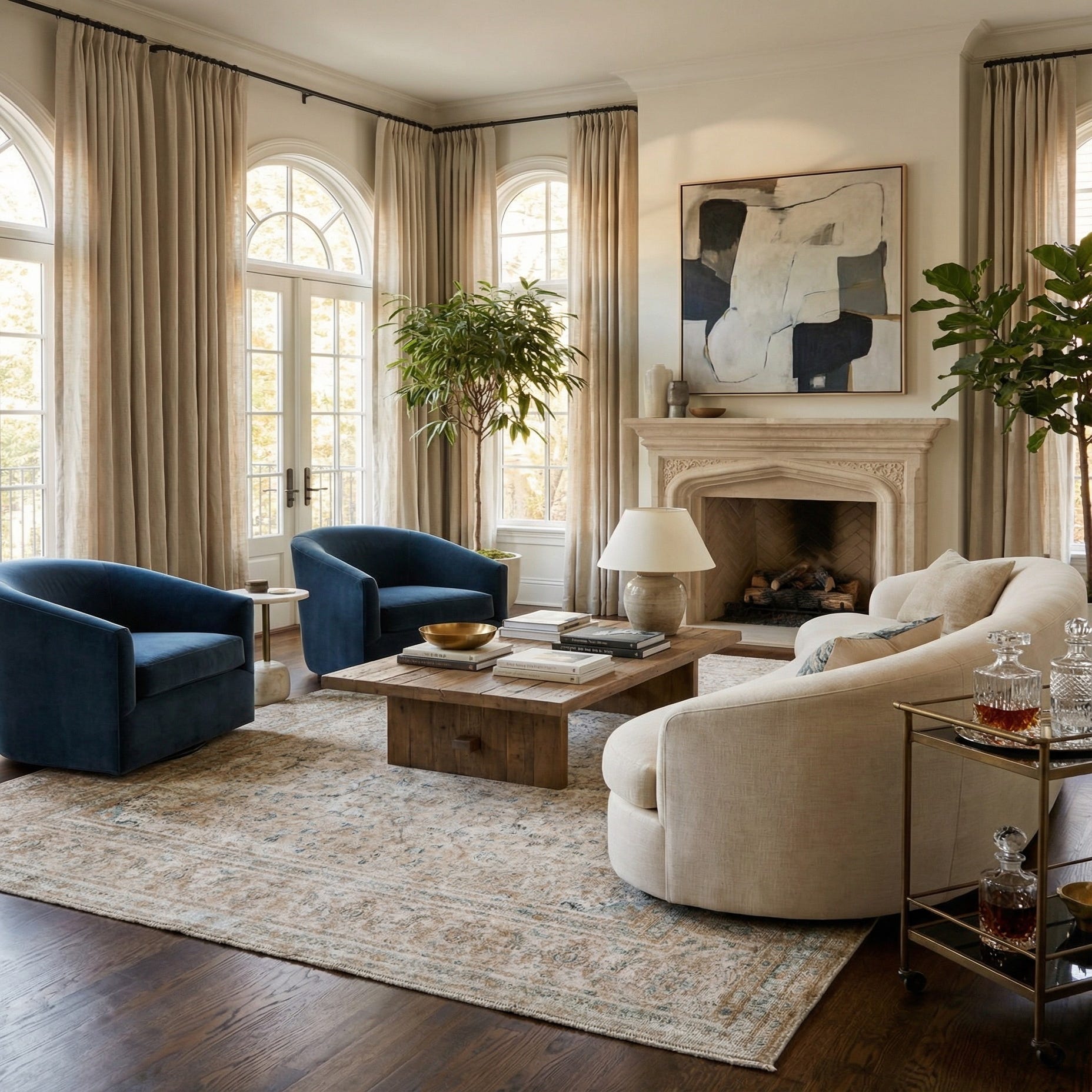 Primary color is Beige. Colors in this rug include: Beige, Brown, Navy Blue.