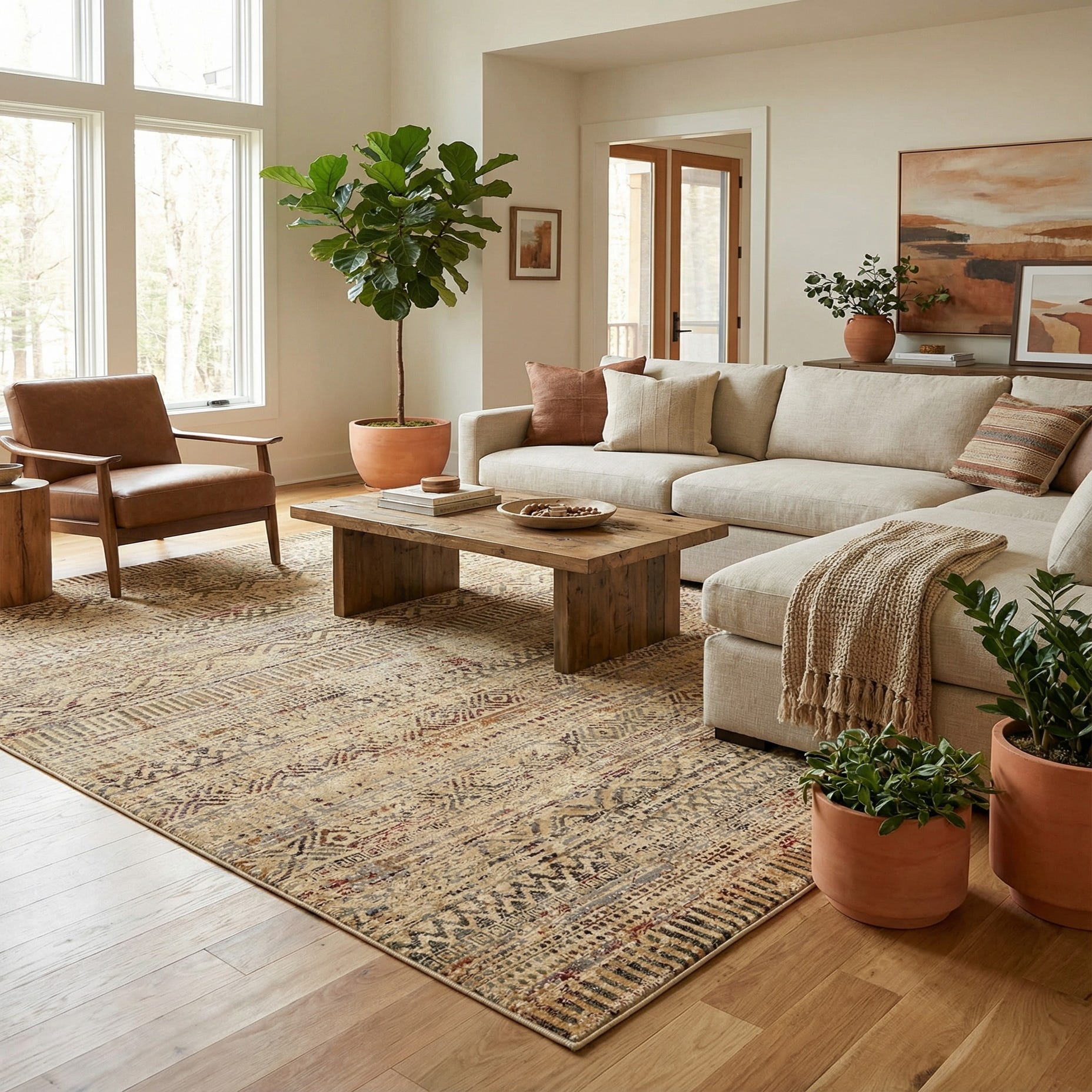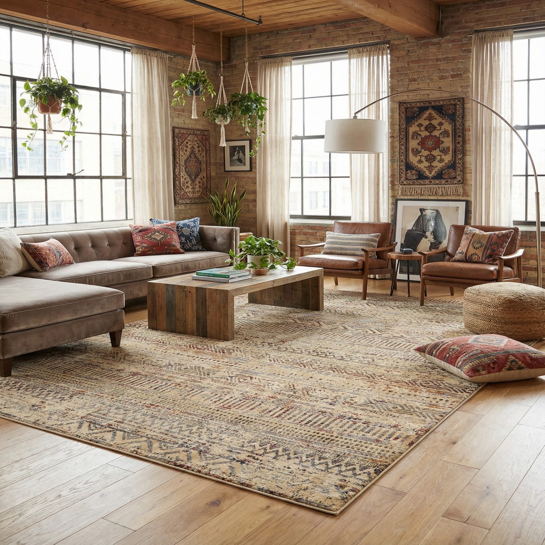 Primary color is Beige. Colors in this rug include: Beige, Brown, Gray, Olive, Red.